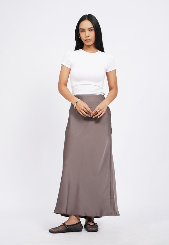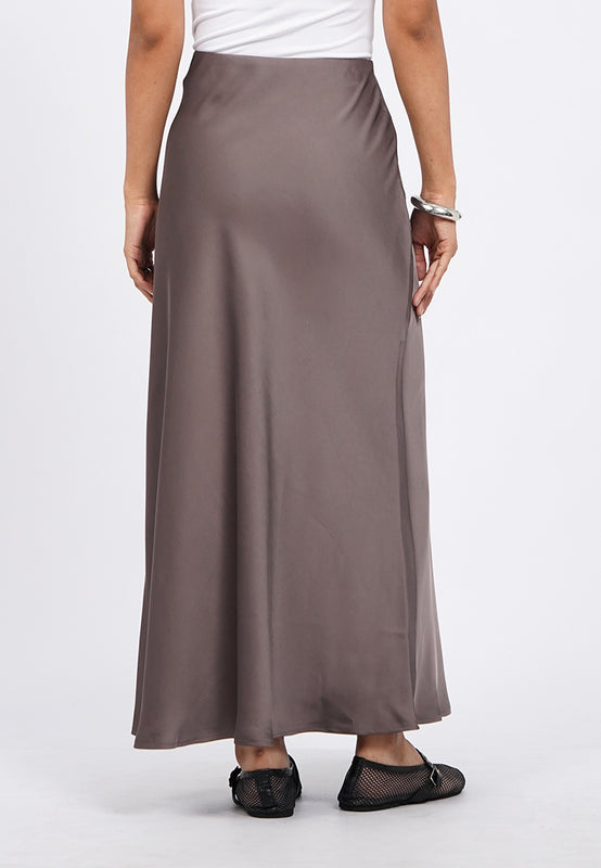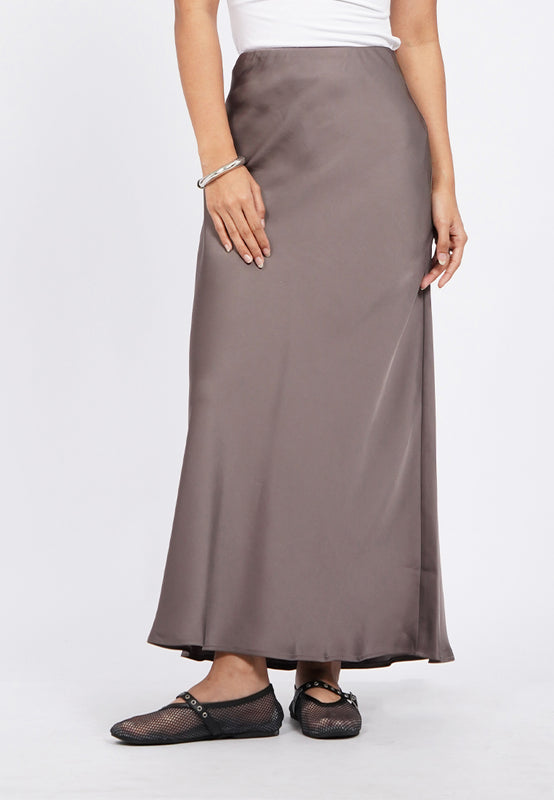 Ankle length maxi skirt, A-line, Flowy fabric, Side zipper opening, Material: Satin, Fit: Regular, Color: Taupe, Model info: Model Wearing Size S, Height: 165 cm, Bust: 86 cm, Waist: 63 cm, Hips: 78 cm