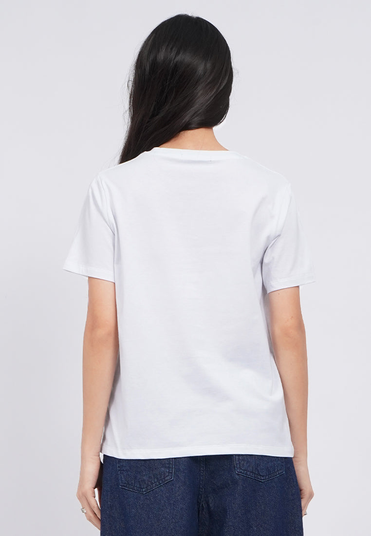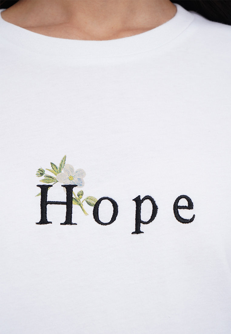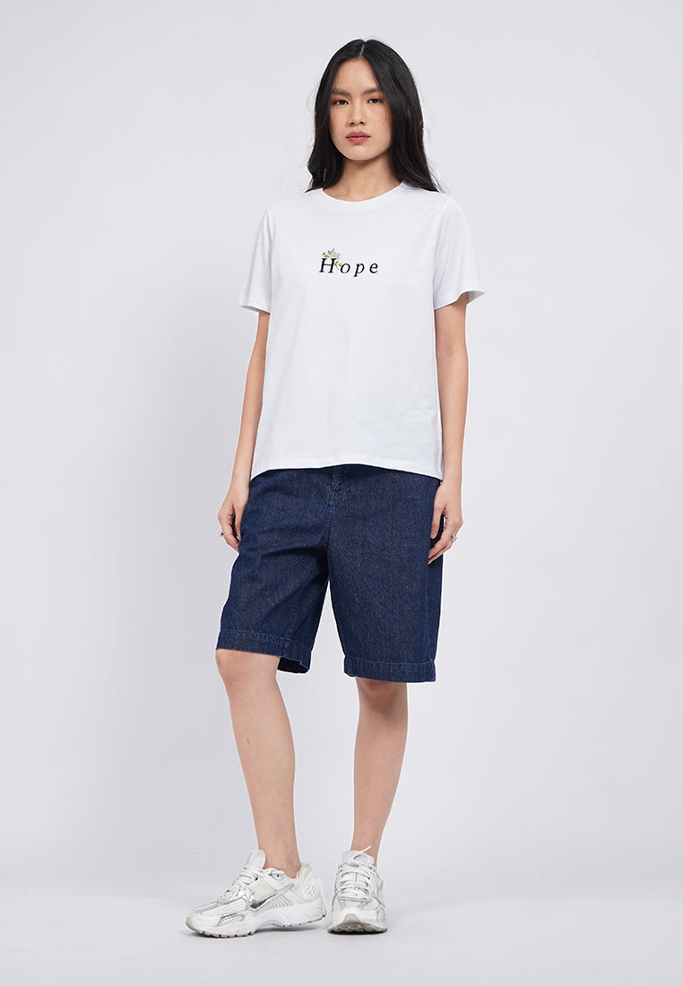 T-shirt lengan pendek, Round neck, Embroidery details at front, Material: Cotton Combed, Fit: Regular, Color: Off White, Model info: Model Wearing Size S, Height: 168cm, Bust: 74cm, Waist: 62cm, Hips: 86cm