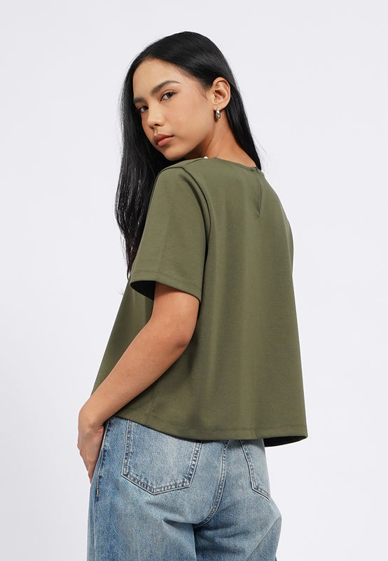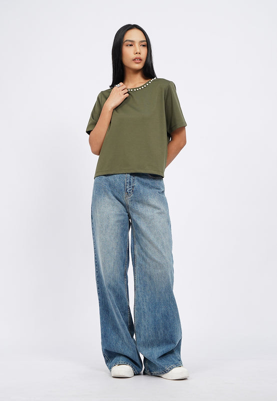 Atasan lengan pendek, Round neck, Contrast pearl details, Material: Ponte, Fit: Regular, Color: Dark Olive, Model info: Model Wearing Size S, Height: 165 cm, Bust: 86 cm, Waist: 63 cm, Hips: 78 cm
