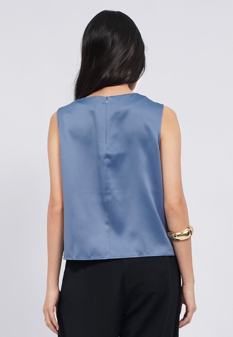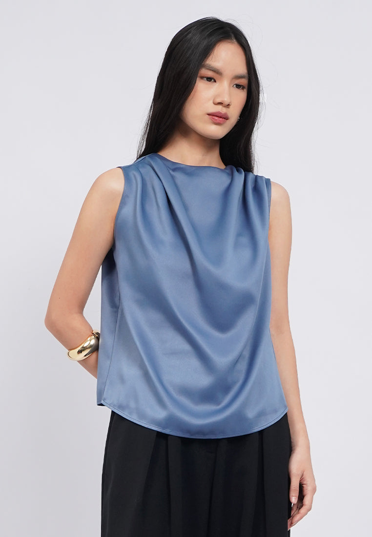 Blouse tanpa lengan, Round neck, Front drape details, Back zipper opening, Material: Satin, Fit: Loose, Color: Indigo, Model info: Model Wearing Size S, Height: 168cm, Bust: 74cm, Waist: 62cm, Hips: 86cm