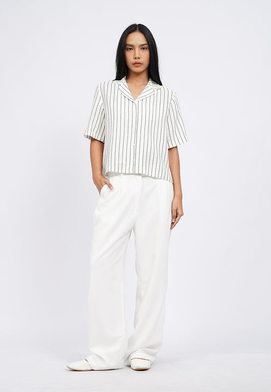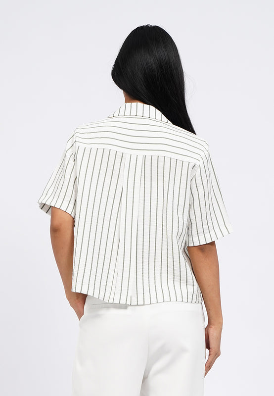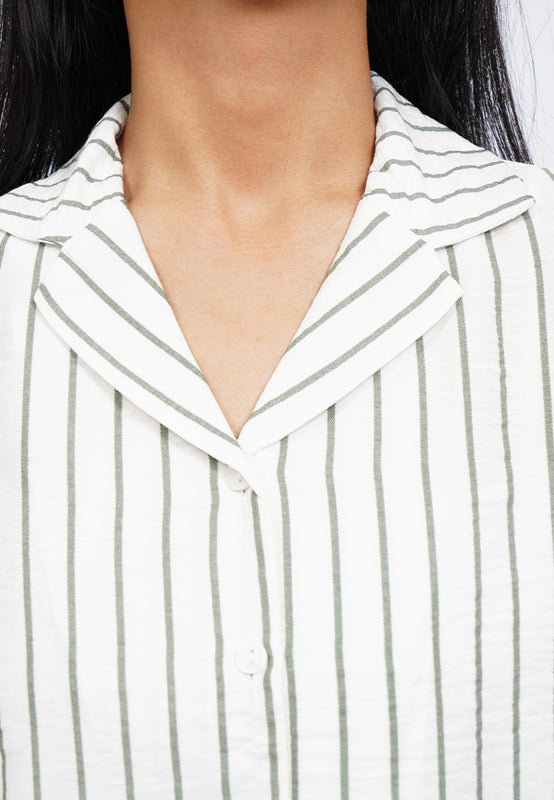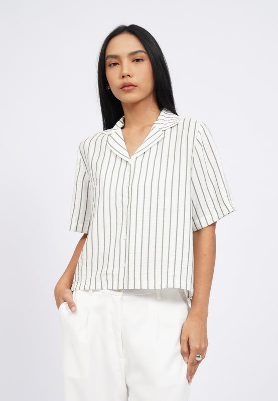 Blouse lengan pendek, Notch collar, Stripes printed fabric, Front button opening, Material: Rayon, Fit: Boxy, Color: Frosty Green, Model info: Model Wearing Size S, Height: 165 cm, Bust: 86 cm, Waist: 63 cm, Hips: 78 cm