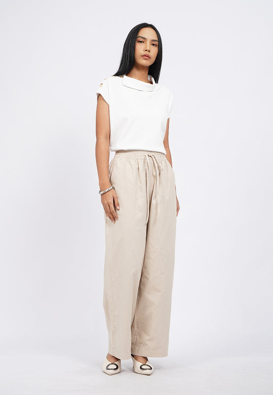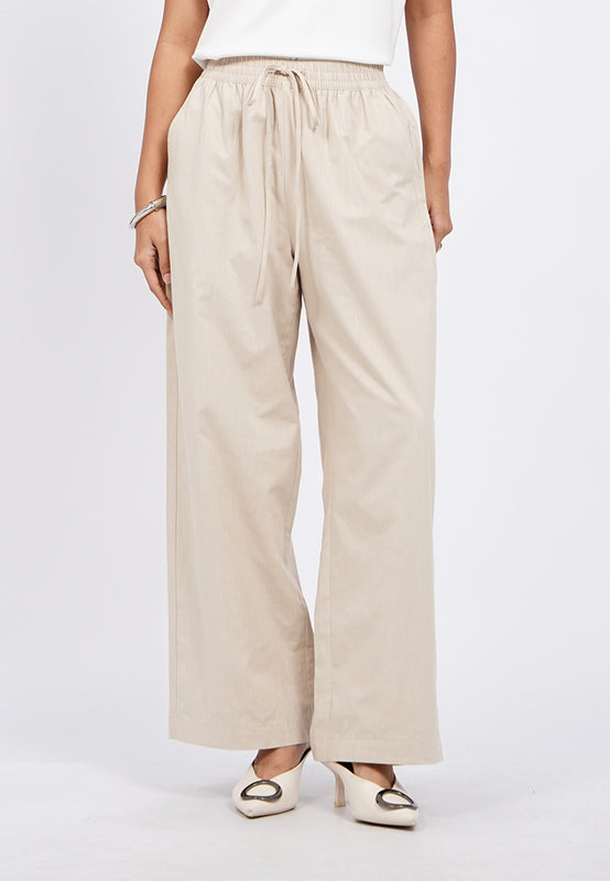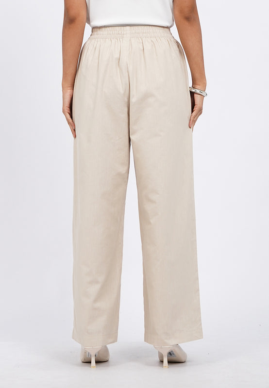 Celana panjang wide leg, Elastic waist with drawstring, Side pocket details, Material: Cotton Linen, Fit: High Regular Wide Ankle, Color: Beige, Model info: Model Wearing Size S, Height: 165 cm, Bust: 86 cm, Waist: 63 cm, Hips: 78 cm