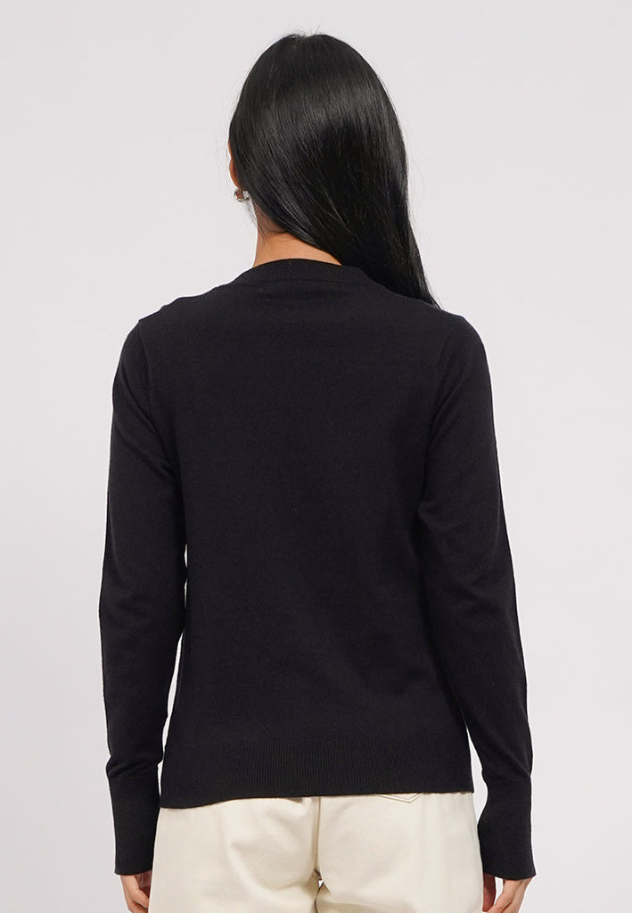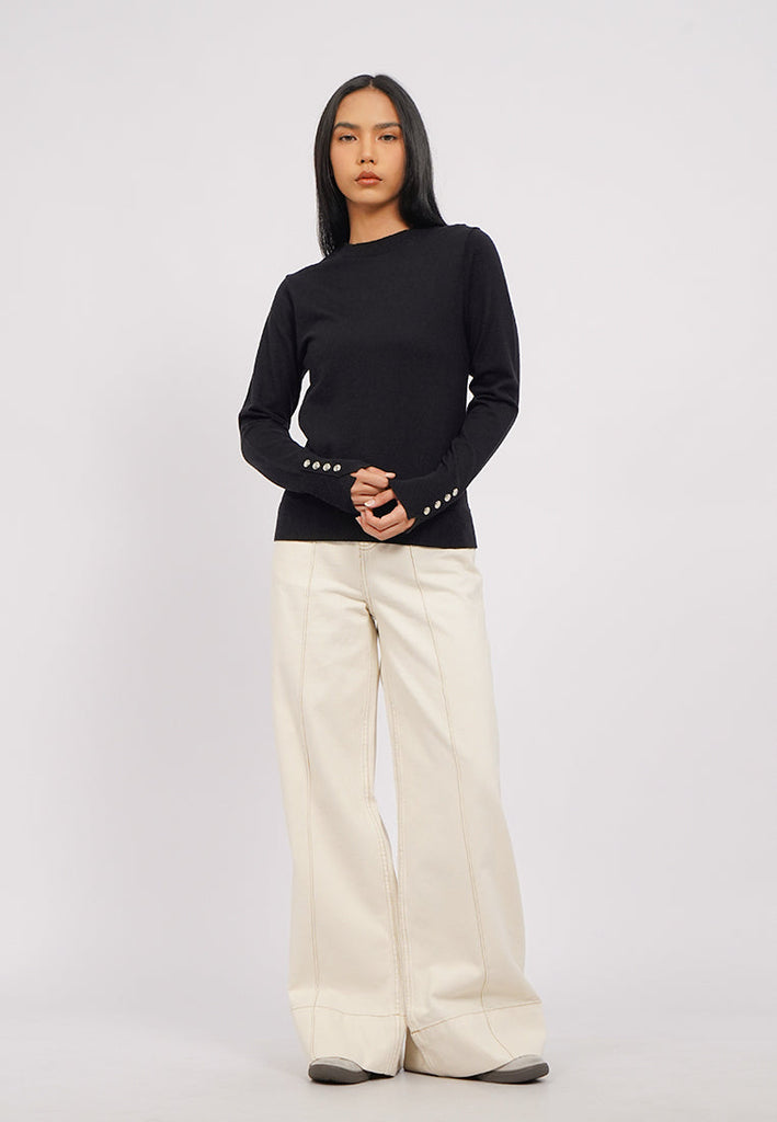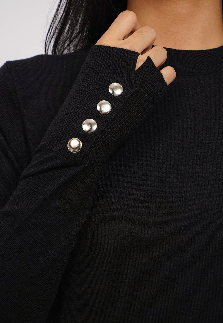 Atasan lengan panjang, Round neck, Soft touch knit fabric, Contrast button on sleeve opening, Material: Soft Knit, Fit: Regular, Color: Black, Model info: Model Wearing Size S, Model Height: 165 cm, Bust: 86 cm, Waist: 63 cm, Hips: 78 cm, Art: 5-SWGKSG225J055