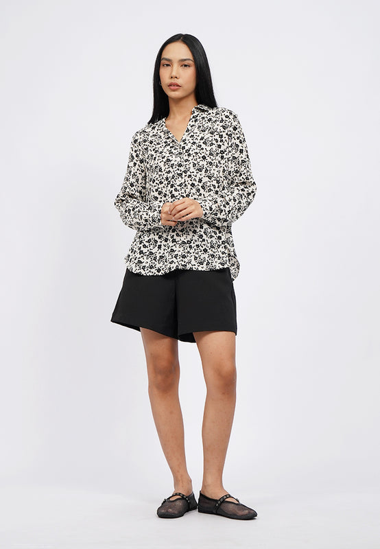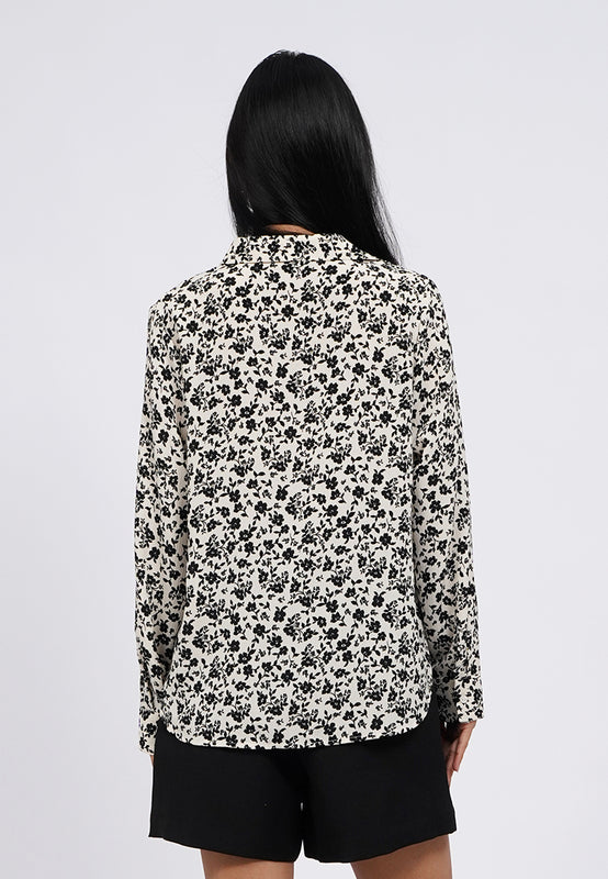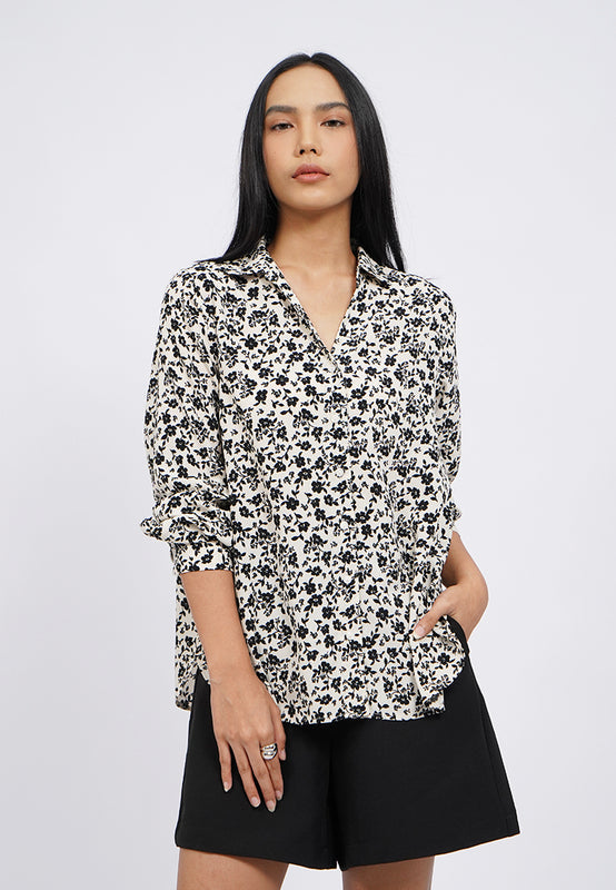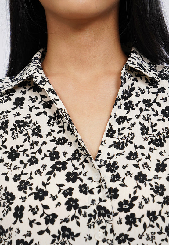 Blouse lengan panjang, V-neck with collar, Floral printed fabric, Front button opening, Material: Polyester, Fit: Loose, Color: Off White, Model info: Model Wearing Size S, Height: 165 cm, Bust: 86 cm, Waist: 63 cm, Hips: 78 cm