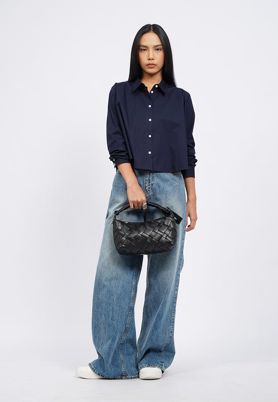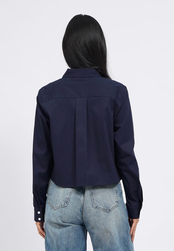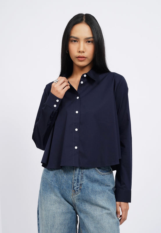 Kemeja lengan panjang, Crop length, Flare cut, Contrast button opening, Back pleat details, Material: Cotton, Fit: Loose Crop, Color: Navy, Model info: Model Wearing Size S, Height: 165 cm, Bust: 86 cm, Waist: 63 cm, Hips: 78 cm