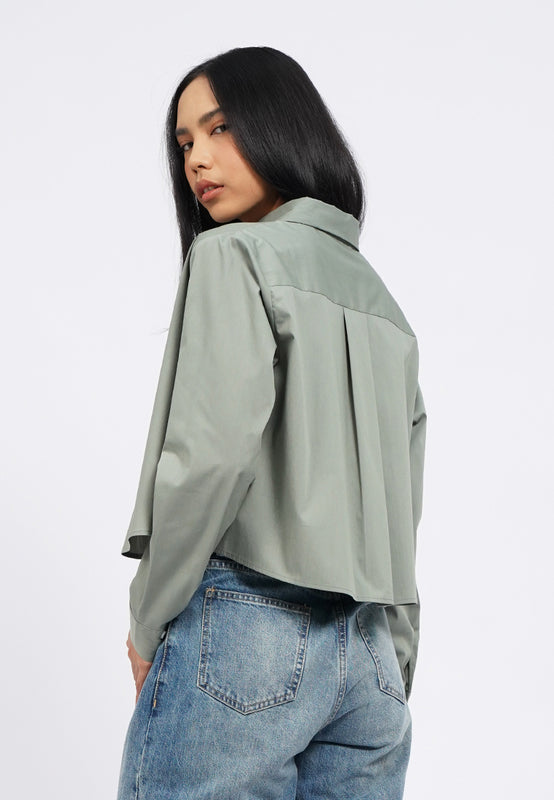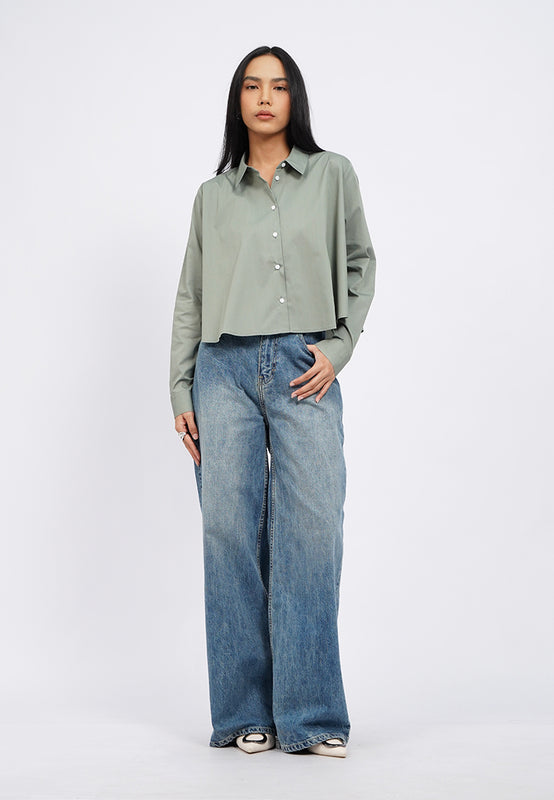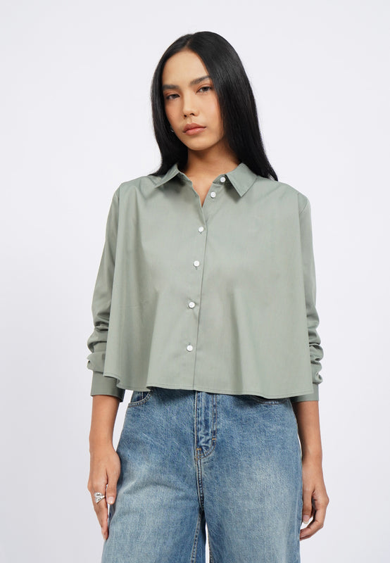 Kemeja lengan panjang, Crop length, Flare cut, Contrast button opening, Back pleat details, Material: Cotton, Fit: Loose Crop, Color: Frosty Green, Model info: Model Wearing Size S, Height: 165 cm, Bust: 86 cm, Waist: 63 cm, Hips: 78 cm