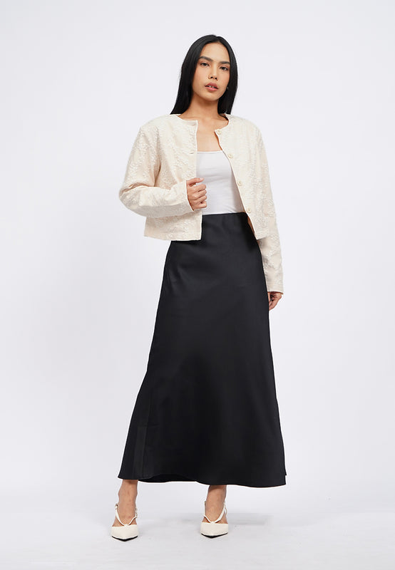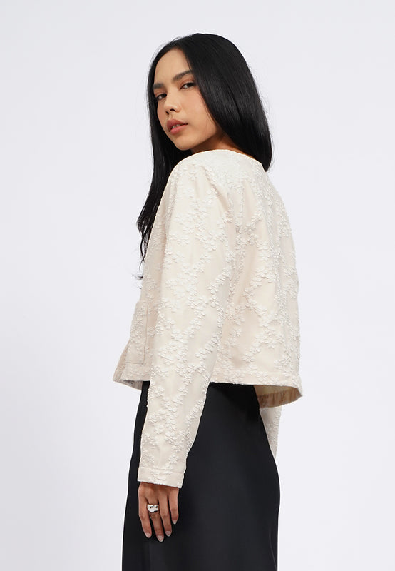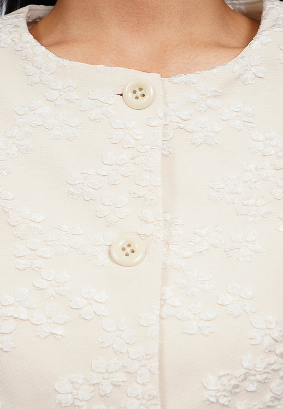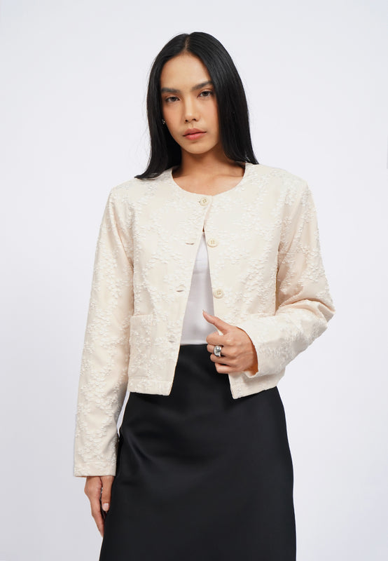 Blazer lengan panjang, Round neck, Textured fabric, Front button opening, Material: Jacquard, Fit: Regular Crop, Color: Ecru, Model info: Model Wearing Size S, Height: 165 cm, Bust: 86 cm, Waist: 63 cm, Hips: 78 cm