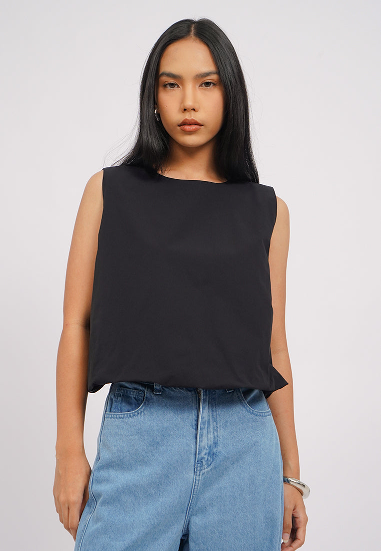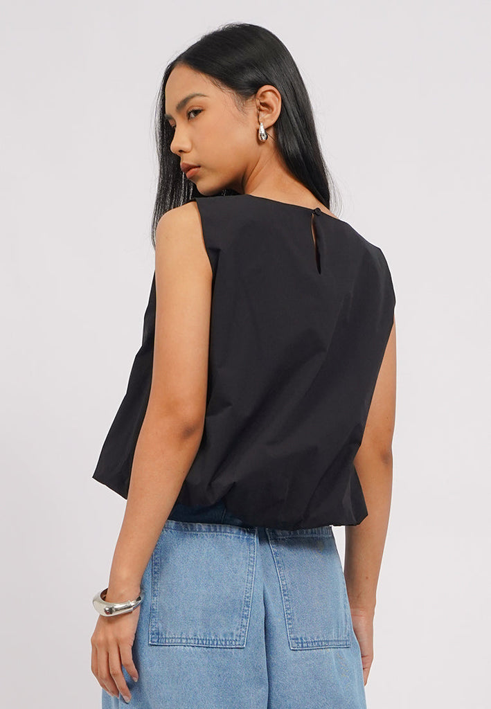 Atasan tanpa lengan, Bubbled hem details, Back button opening, Crop length, Material: Polyester, Fit: Regular Crop, Color: Black, Model info: Model Wearing Size S, Model Height: 165 cm, Bust: 86 cm, Waist: 63 cm, Hips: 78 cm, Art: 5-SLWKCA225J148