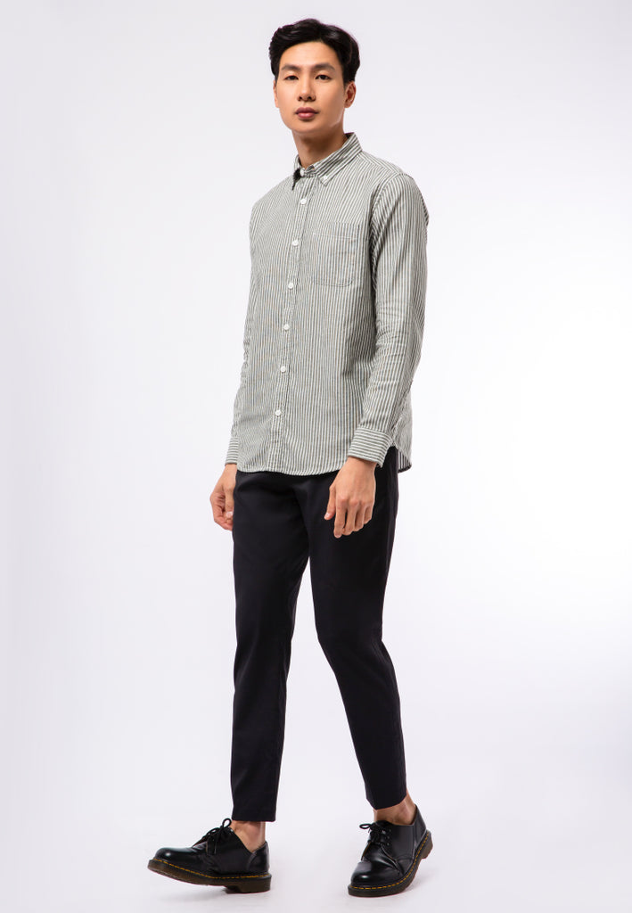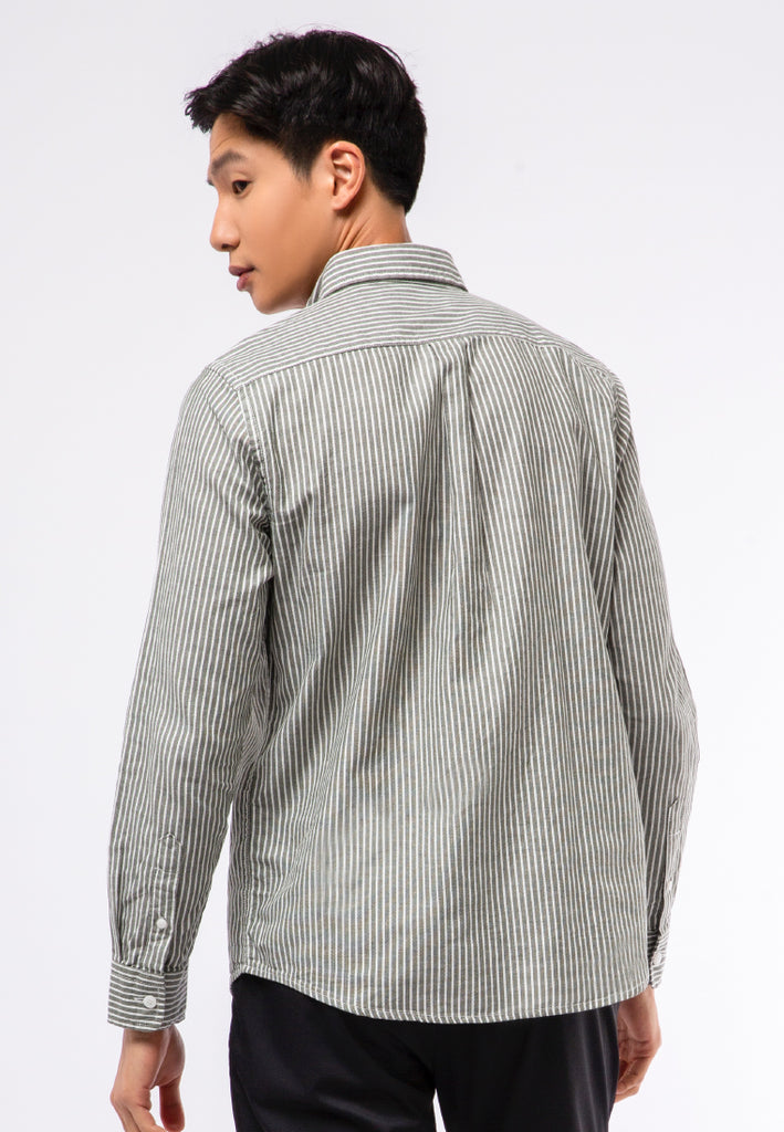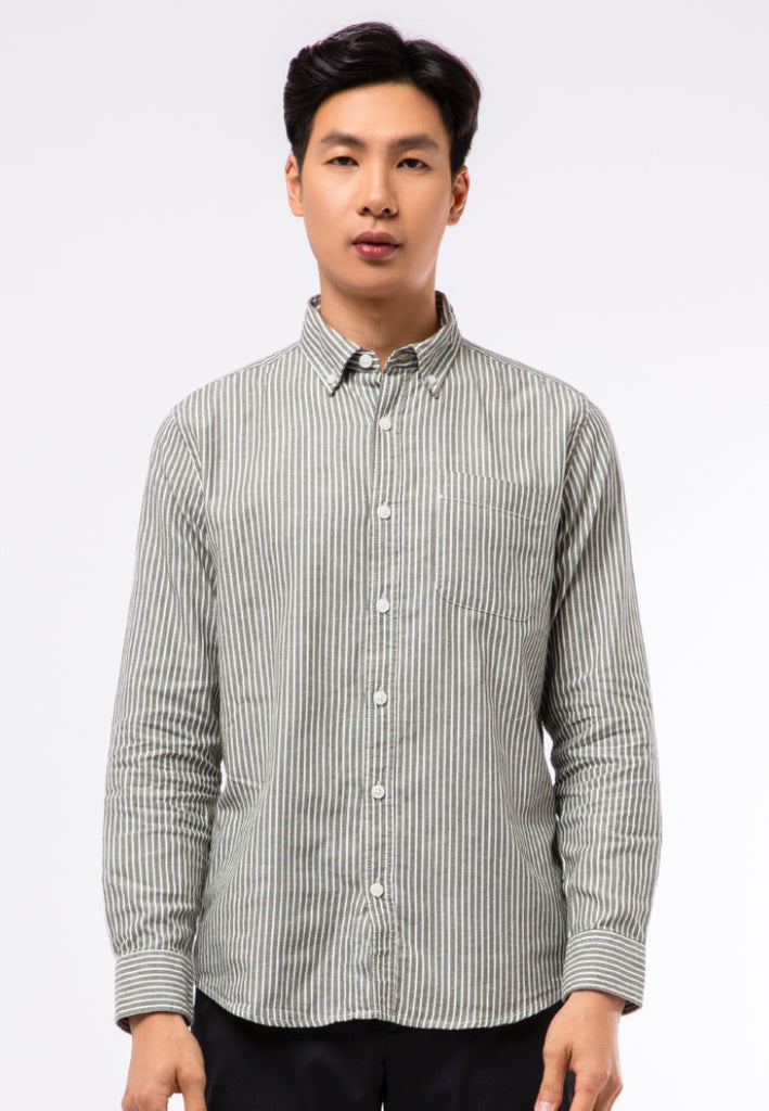 Kemeja lengan panjang, Button down collar, Front pocket details, Stripe printed fabric, Contrast front button opening, Material: 100% Cotton, Fit: Regular, Color: Olive, Model info: Model Wearing Size 15.5 For Tops, Model Height 184 cm, Bust: 91cm, Waist: 77cm, Hips: 97cm, Art: 1-LSRCRT122C195