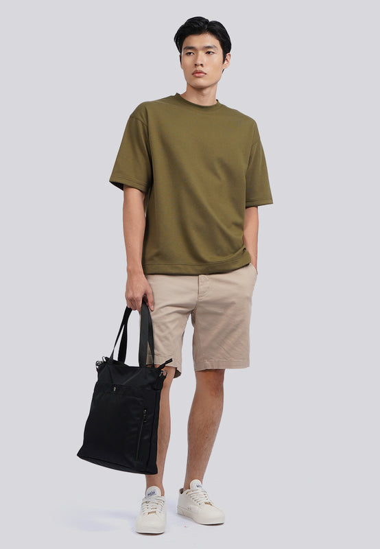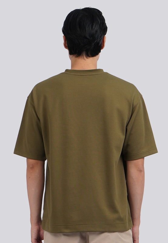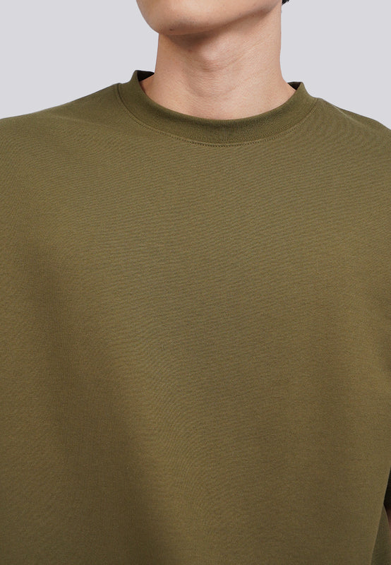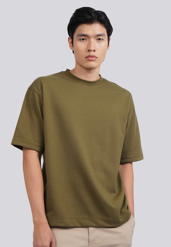 T-shirt lengan pendek, Ribbed round neck, Drop shoulder details, Material: CVC, Fit: Oversized, Color: Dusty Olive, Model info: HEIGT: 184CM, WAIST: 72CM, HIPS: 85CM, BUST: 92, Art: 1-TSOCRT125E226