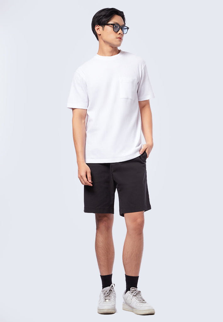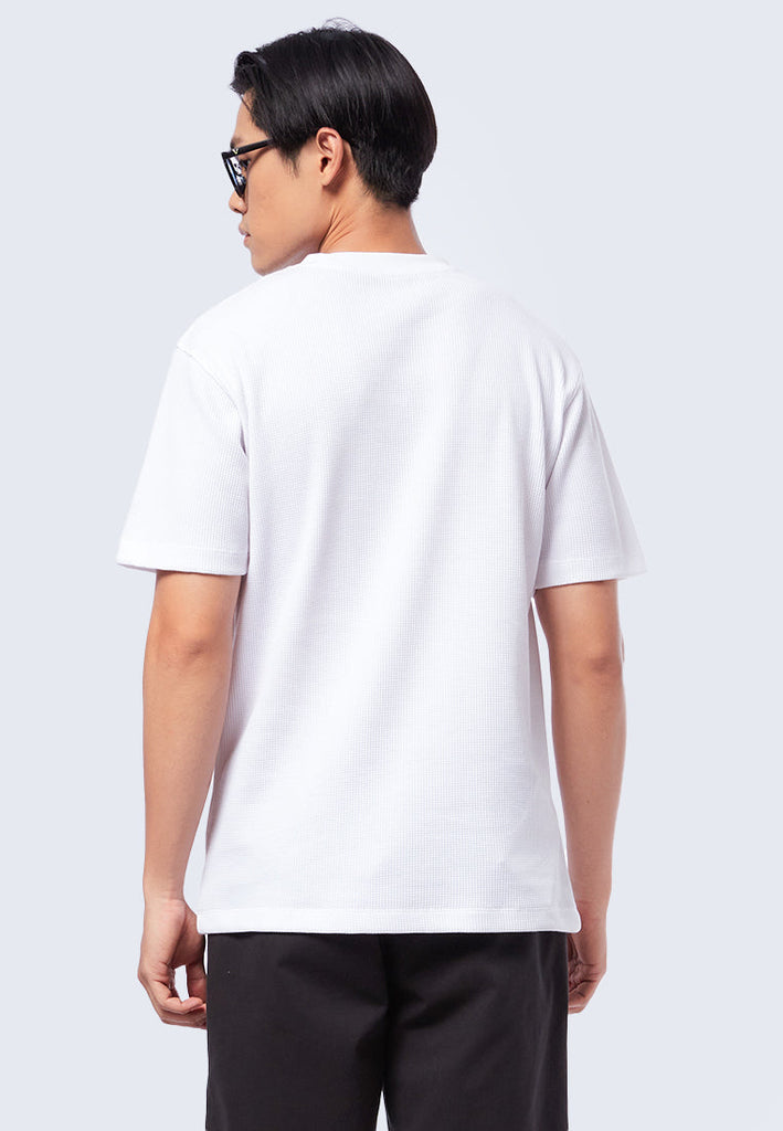 T-shirt lengan pendek, Round neck, Front pocket details, Textured fabric, Material: Cotton, Fit: Regular, Color: White, Model info: Model Wearing Size M for Top, Size 31 for pants, Model Height 186 cm, Bust: 88 cm, Waist: 69 cm, Hips: 85 cm, Art: 1-TSRCRT223H396