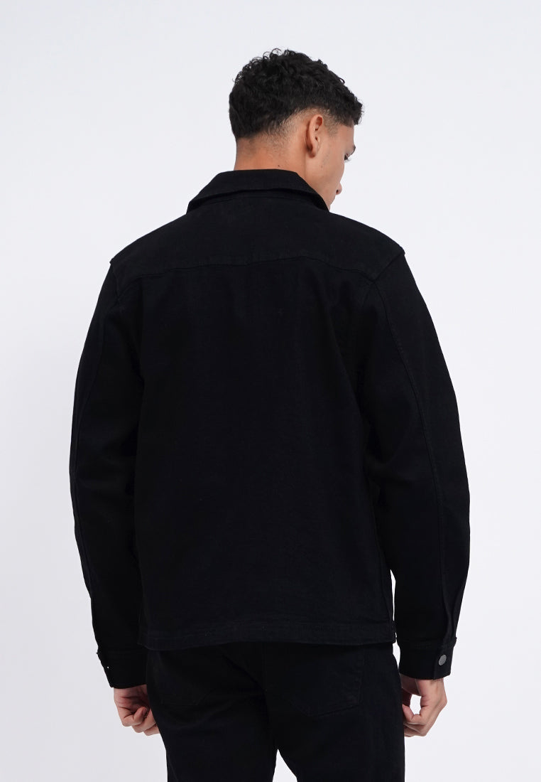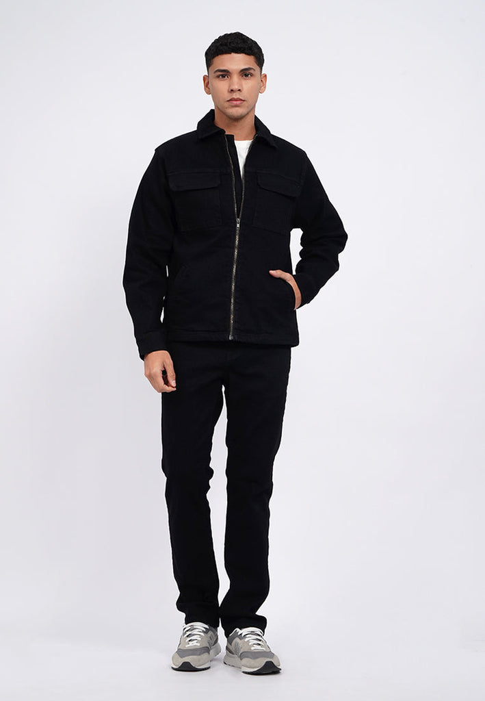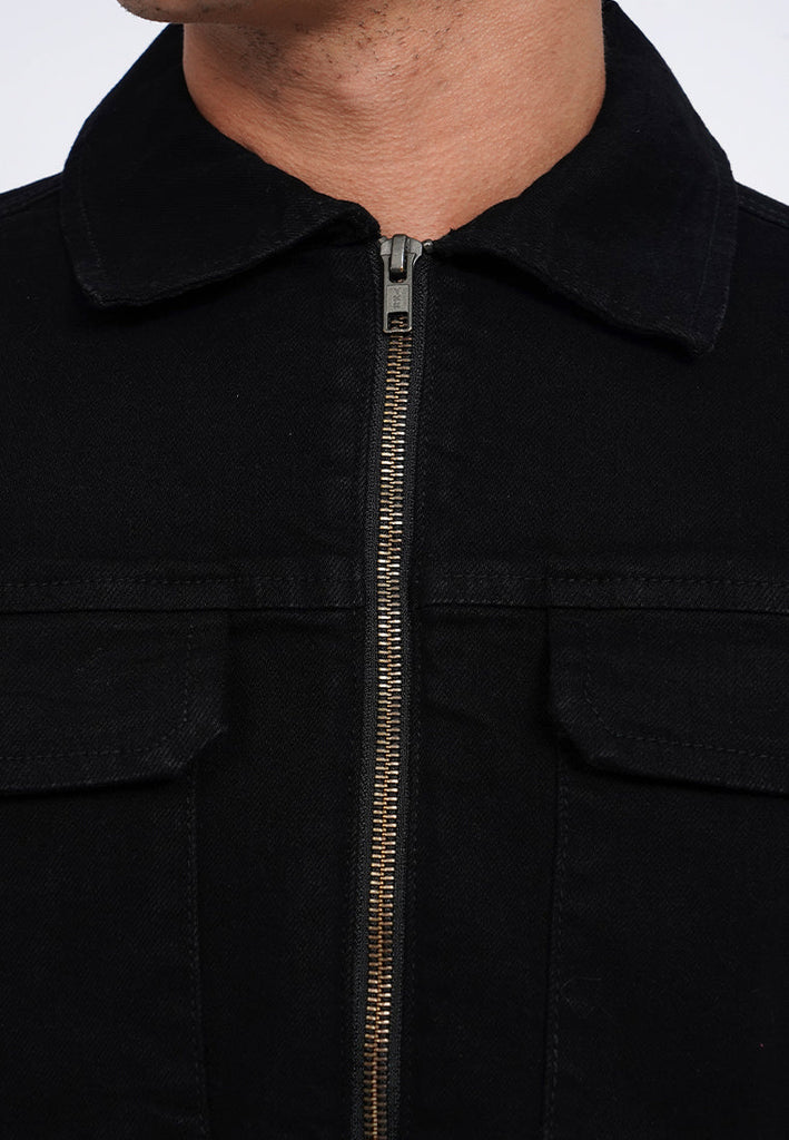 Jaket denim dengan fitting slim fit dan washing black. Dilengkapi dengan dua kantong pada bagian chest- kanan dan kiri pakai dan dua kantong pada bagian bawah bawah. Bukaan menggunakan resleting pada bagian depan. Berbahan denim 100% cotton yang nyaman saat dipakai., Material: 100% Cotton, Fit: Regular, Color: Black, Model info: Model Wearing Size M, Model Height: 182, Waist: 75, Bust: 94, Hips: 96