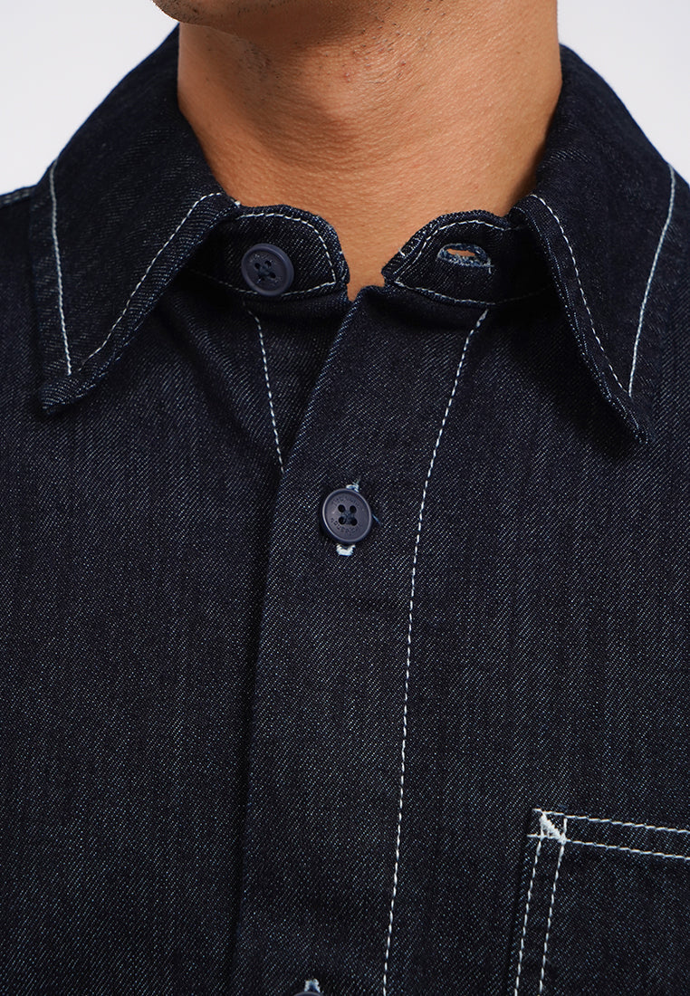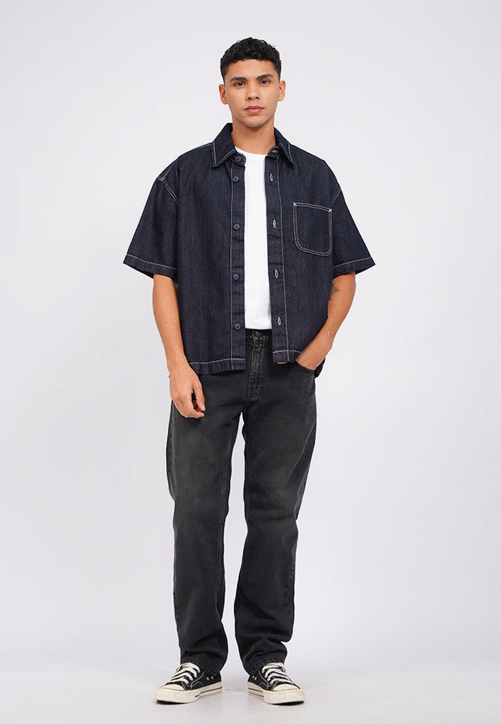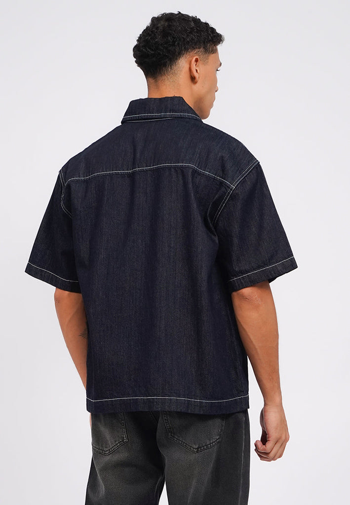 Kemeja lengan pendek denim dengan fitting boxy, dengan washing dark blue. Berbahan 100% cotton denim yang adem dan nyaman dipakai. Dilengkapi dengan satu kantong pada bagian chest- kiri. Bukaan menggunakan button pada bagian depan, Material: 100% Cotton, Fit: Relaxed Fit, Color: Dark Blue, Model info: Model wearing size M, Height: 182 cm, Chest: 94 cm, Waist: 75 cm, Hips: 96 cm
