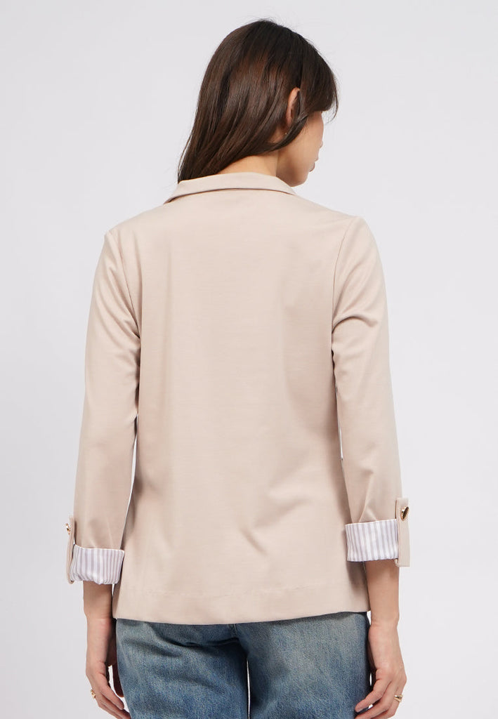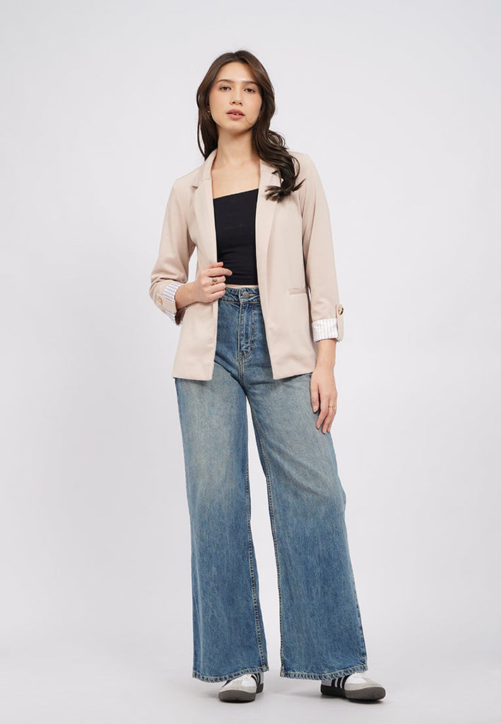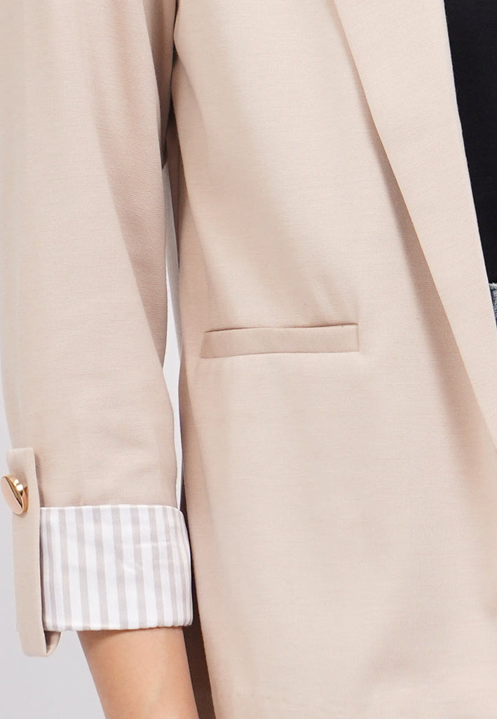 Blazer lengan panjang, V-neck with lapel, Open front, Roll up sleeves with button details, Material: Ponte, Fit: Regular, Color: Beige, Model info: Model Wearing Size S, Height: 175cm, Bust: 89, Waist: 69, Hips: 89, Art: 5-BZKKSG225J238