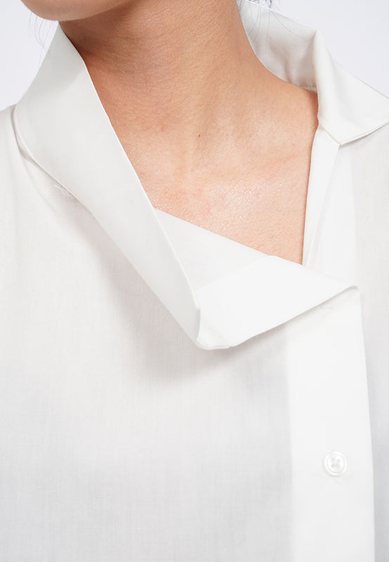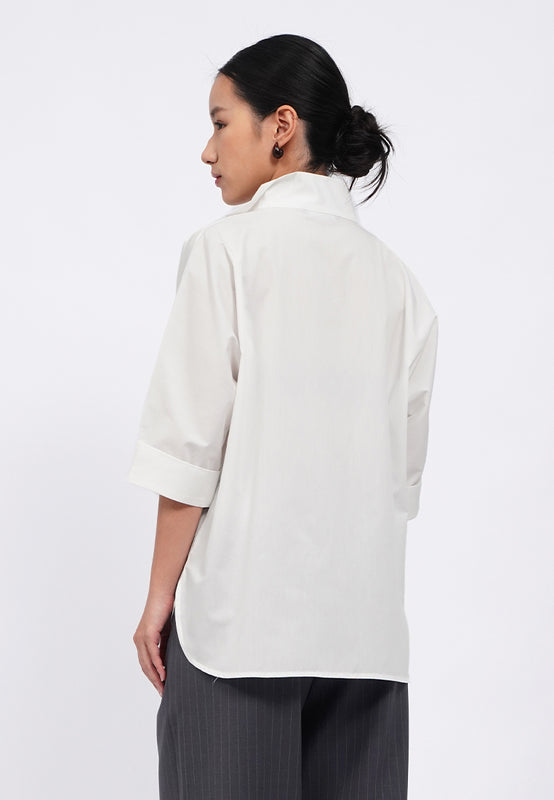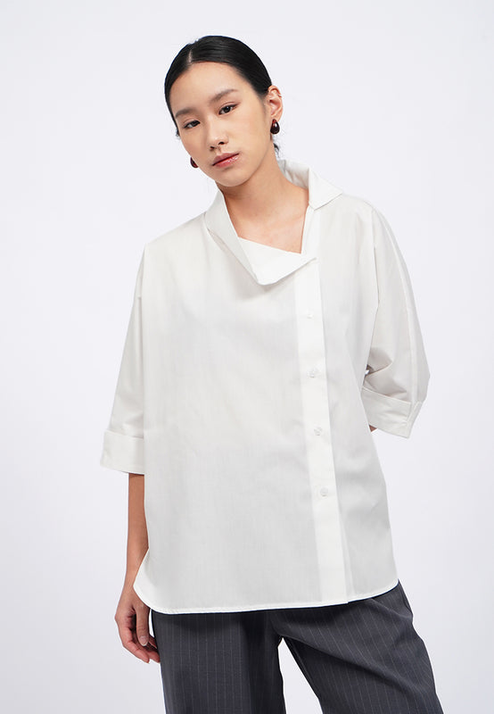 Blouse lengan pendek, High neck, Asymmetric placket details, Front button opening, Material: Polyester, Fit: Loose, Color: Off White, Model info: Model Wearing Size S, Height: 165 cm, Bust: 82 cm, Waist: 63 cm, Hips: 83 cm