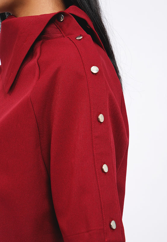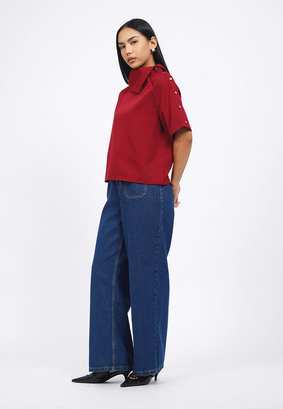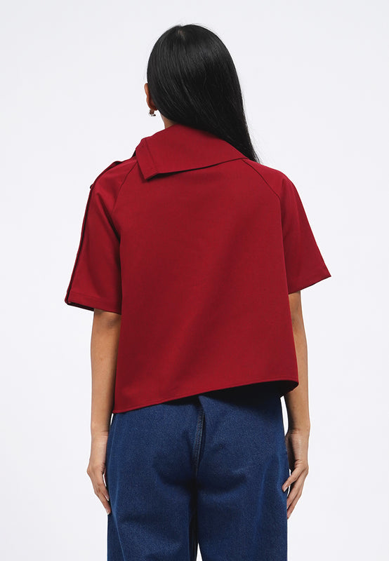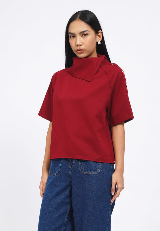 Blouse lengan pendek, Asymmetrical collar, Button details on shoulder, Material: Polyester, Fit: Regular, Color: Maroon, Model info: Model Wearing Size S for Top, Size S for Pants, Model Height 165 cm, Bust: 86 cm, Waist: 63 cm, Hips: 78 cm