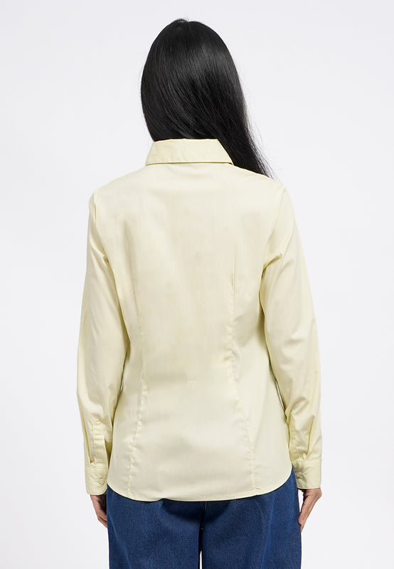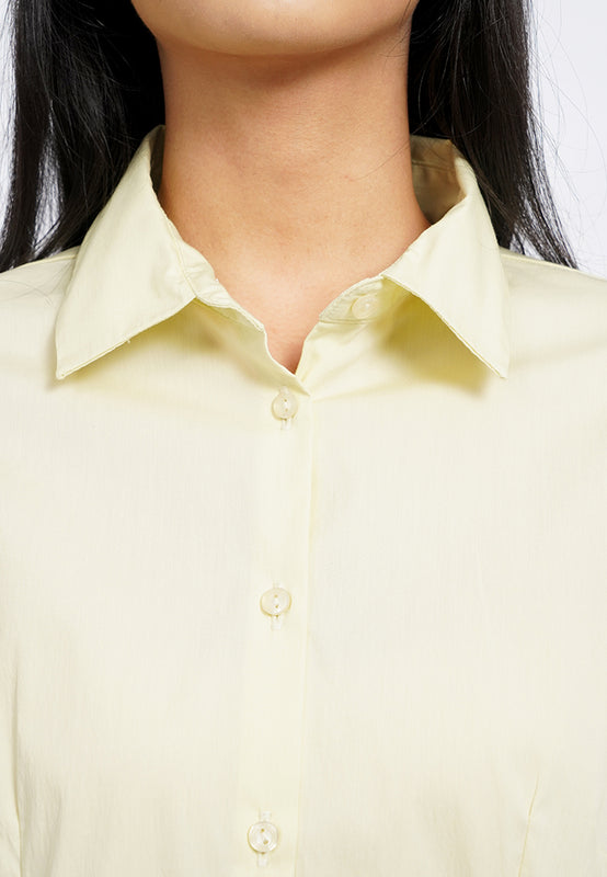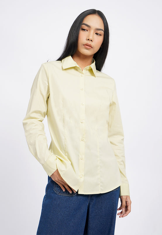 Kemeja lengan panjang, Rounded hem bottom, Front button opening, Material: Cotton Nylon Spandex, Fit: Slim, Color: Soft Yellow, Model info: Model Wearing Size S for Top, Size S for Pants, Model Height 165 cm, Bust: 86 cm, Waist: 63 cm, Hips: 78 cm