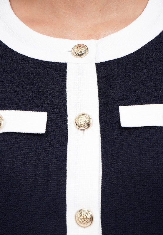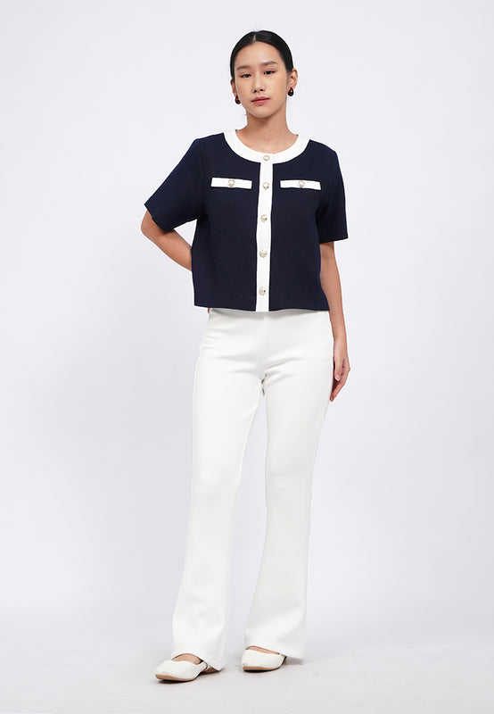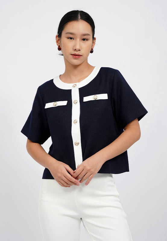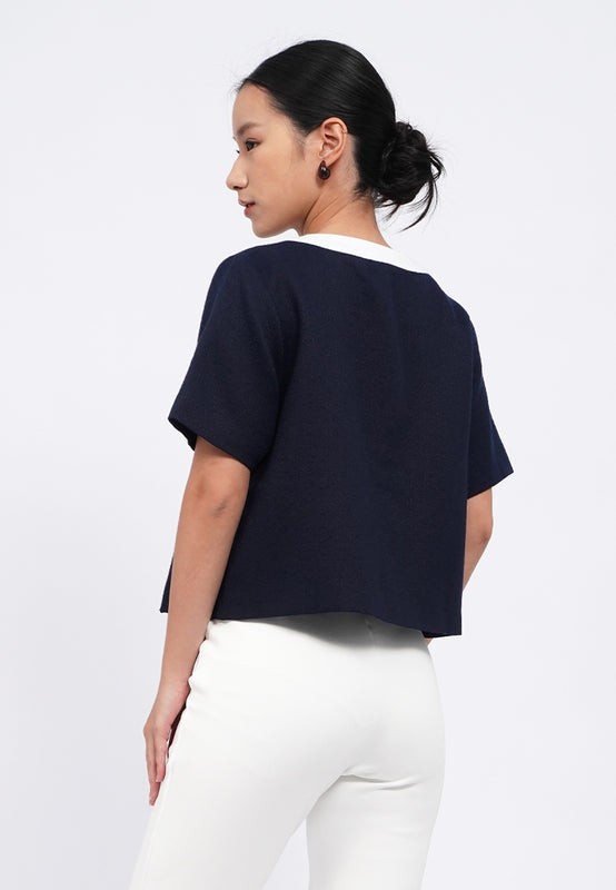 Blouse lengan pendek, Round neck, Fancy front button opening, Textured fabric, Material: Tweed, Fit: Regular, Color: Navy, Model info: Model Wearing Size S, Height: 165 cm, Bust: 82 cm, Waist: 63 cm, Hips: 83 cm