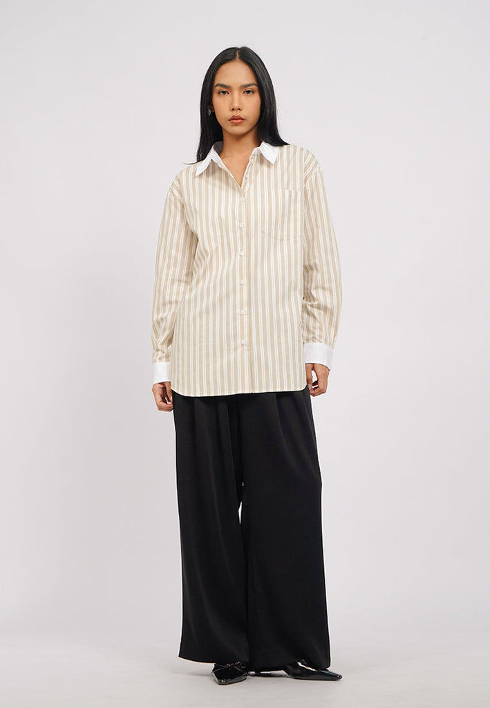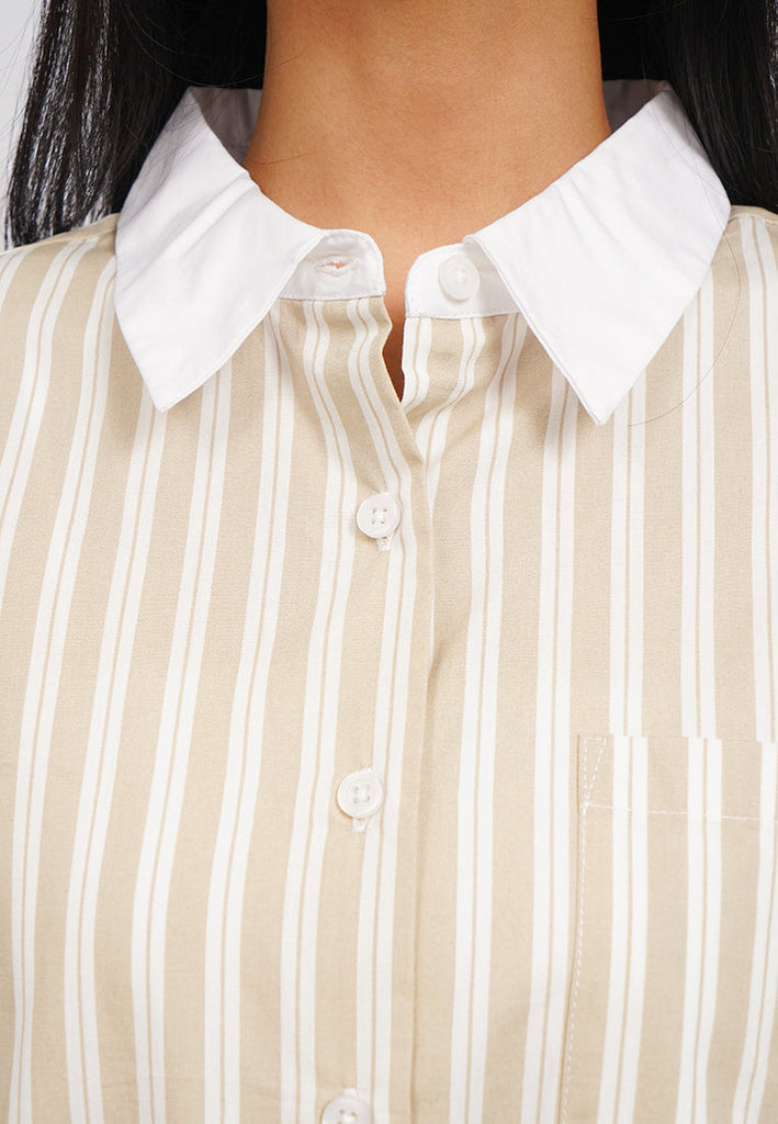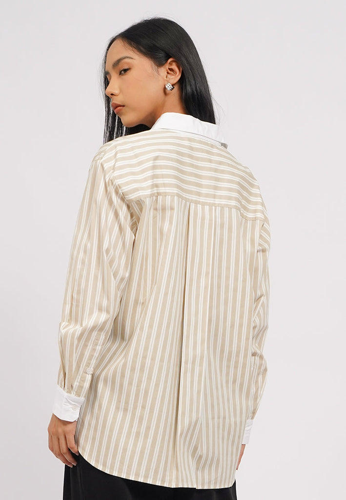 Kemeja lengan panjang, Contrast collar, Front pocket details, Stripes printed fabric, Material: Cotton, Fit: Oversized, Color: Beige, Model info: Model Wearing Size S, Model Height: 165 cm, Bust: 86 cm, Waist: 63 cm, Hips: 78 cm, Art: 5+BLWKCA225J177