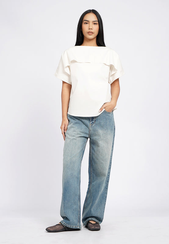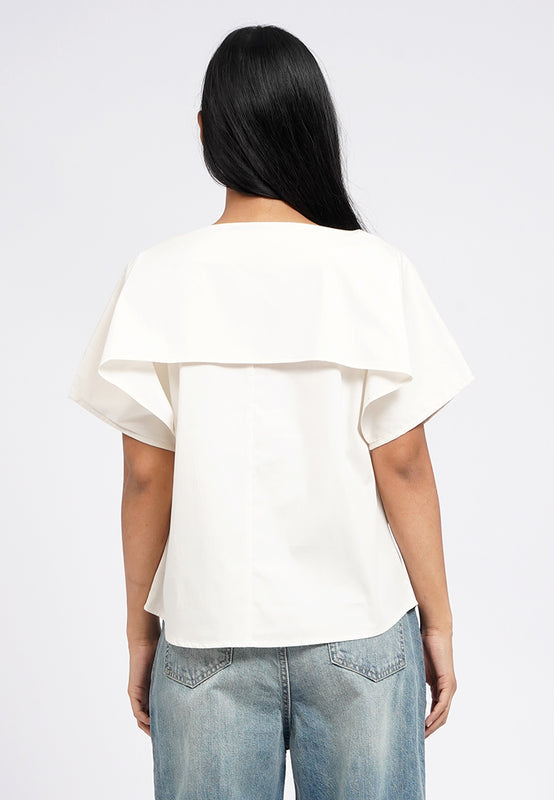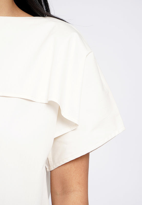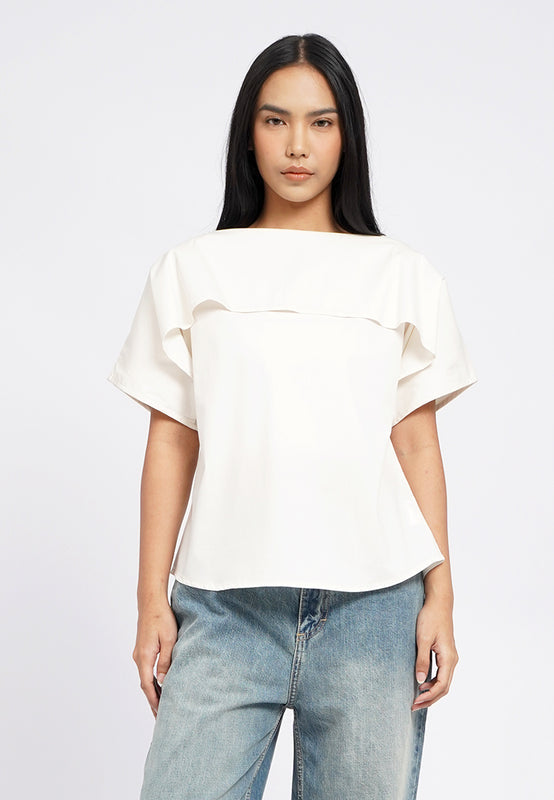 Atasan lengan pendek, Boat neck with drape details, Loose cut, Material: Cotton Nylon Spandex, Fit: Regular, Color: Ecru, Model info: Model Wearing Size S for Top, Size S for Pants, Model Height 165 cm, Bust: 86 cm, Waist: 63 cm, Hips: 78 cm