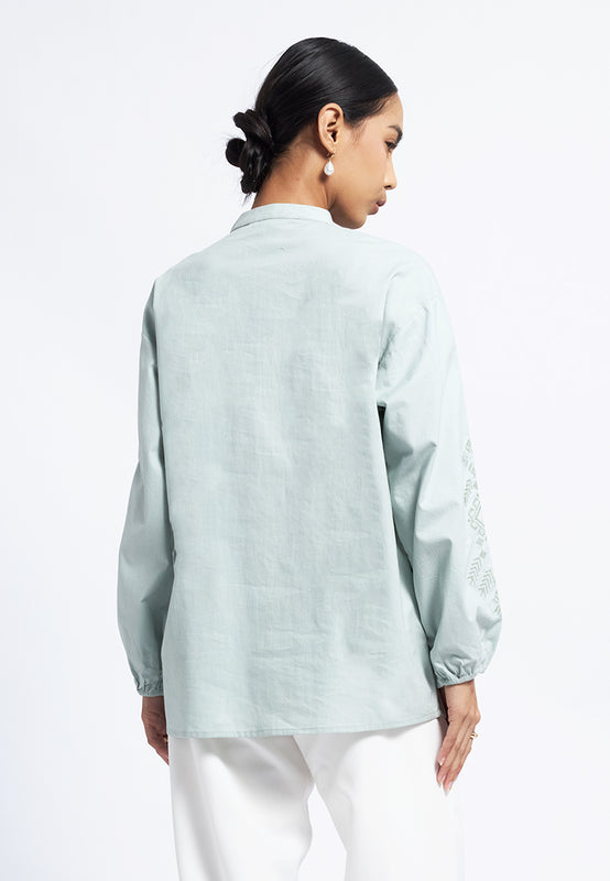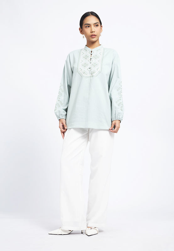 Blouse lengan panjang, Mandarin collar, Puff sleeves, Embroidery details, Couple set available, Material: Cotton Linen, Fit: Loose, Color: Mint, Model info: Model Wearing Size S for Top, Size S for Pants, Model Height 165 cm, Bust: 86 cm, Waist: 63 cm, Hips: 78 cm