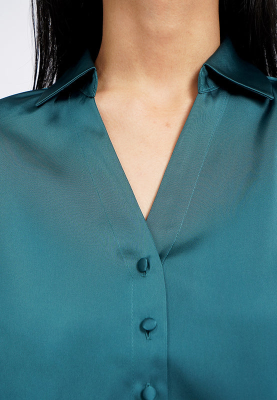 Bra top tanpa lengan, Polo collar, Front zipper opening, Crop length, Material: Church Silk, Fit: Regular Crop, Color: Teal, Model info: Model Wearing Size S for Top, Size S for Pants, Model Height 165 cm, Bust: 86 cm, Waist: 63 cm, Hips: 78 cm
