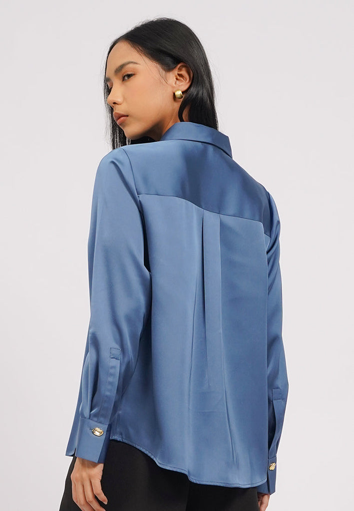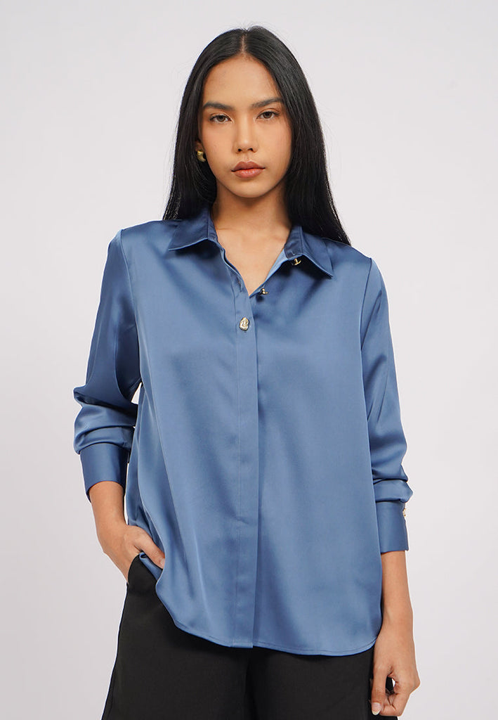 Blouse lengan panjang, Shirt collar, Hidden front button opening, Contrast fancy button details, Material: Silk, Fit: Regular, Color: Indigo, Model info: Model Wearing Size S, Model Height: 165 cm, Bust: 86 cm, Waist: 63 cm, Hips: 78 cm, Art: 5-BLWKSG225J032