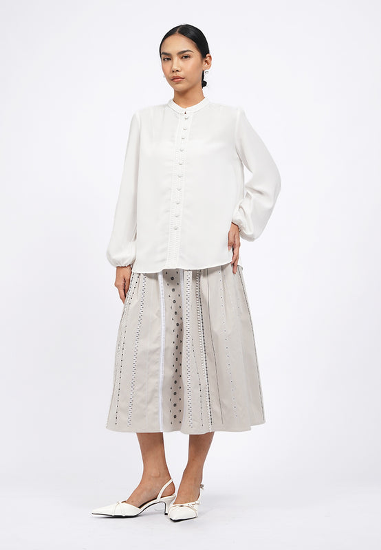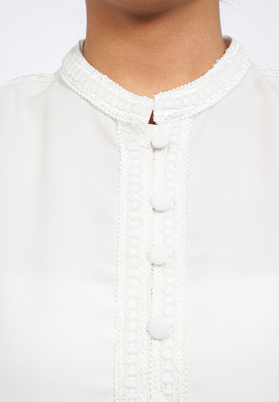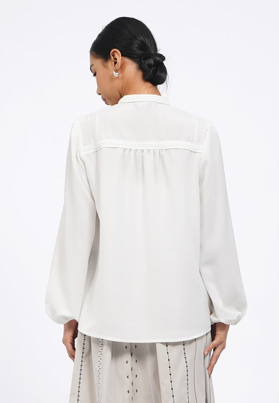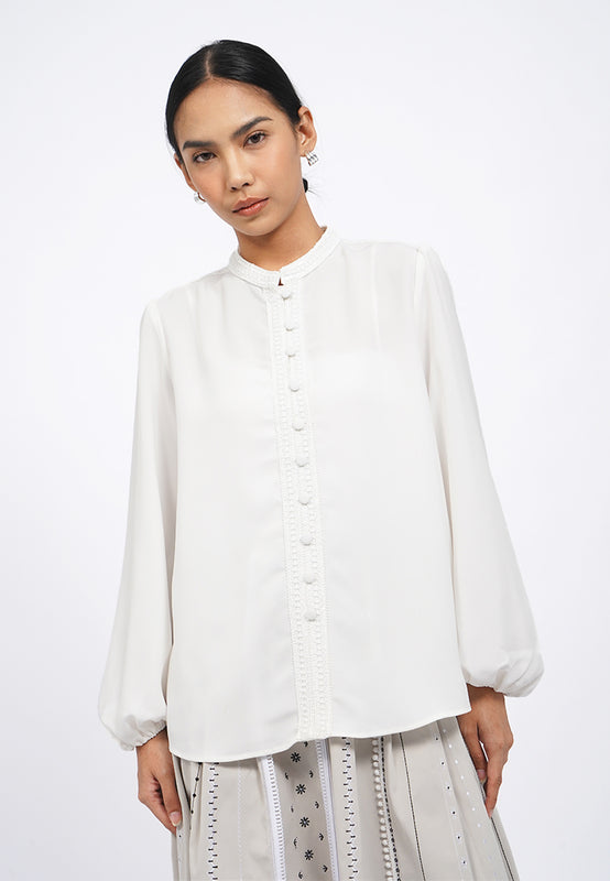Blouse lengan panjang, Mandarin collar with lace details, Puff sleeves, Front button opening, Material: Poly Twill, Fit: Regular, Color: Off White, Model info: Model Wearing Size S for Top, Size S for Pants, Model Height 165 cm, Bust: 86 cm, Waist: 63 cm, Hips: 78 cm