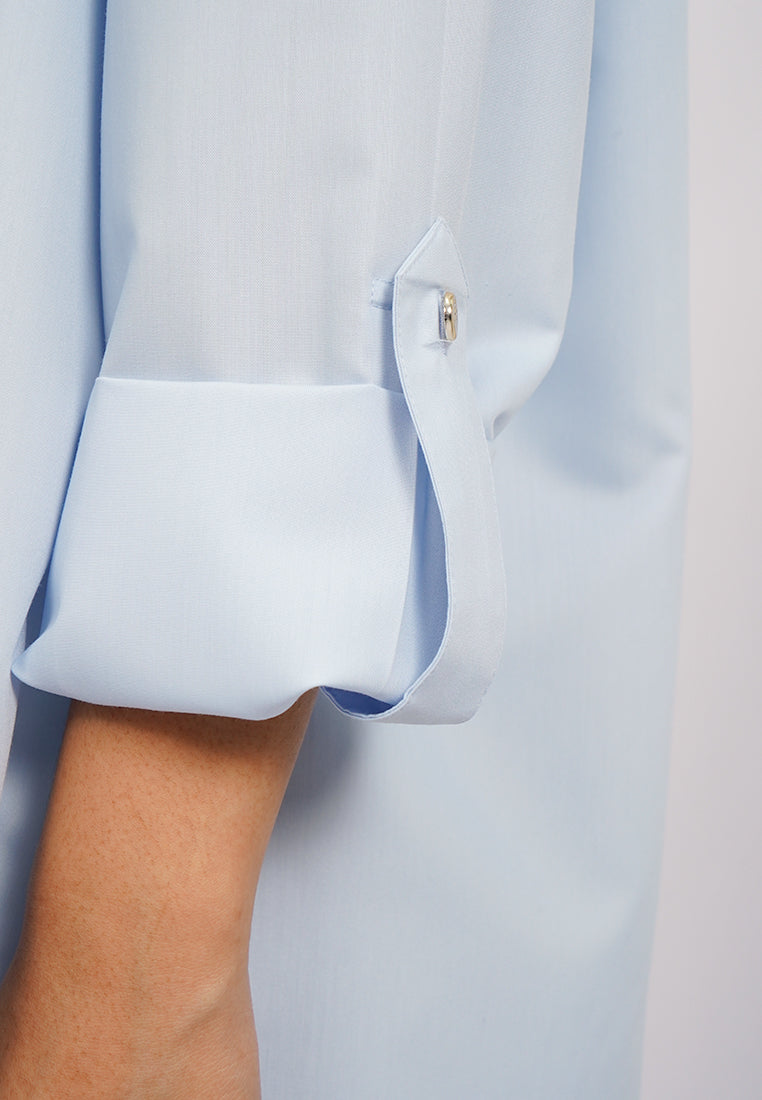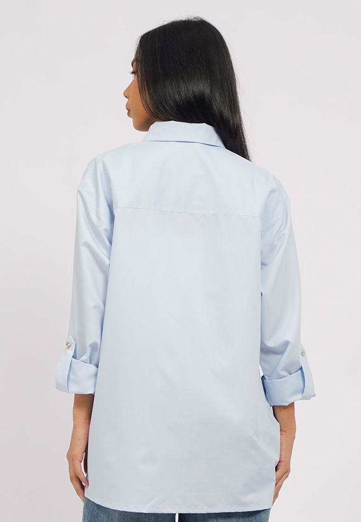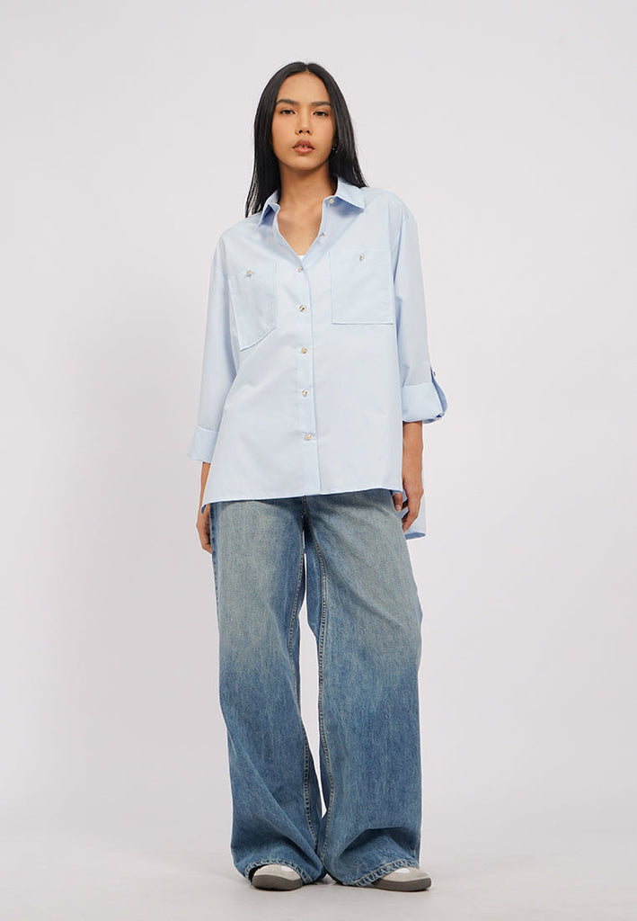 Blouse lengan panjang, Kerah kemeja, Drop shoulder, Roll up sleeves, Double buttoned front pocket, Material: Polyester, Fit: Oversized, Color: Lt. Blue, Model info: Model Wearing Size S, Model Height: 165 cm, Bust: 86 cm, Waist: 63 cm, Hips: 78 cm, Art: 5+BLWKSG225J037