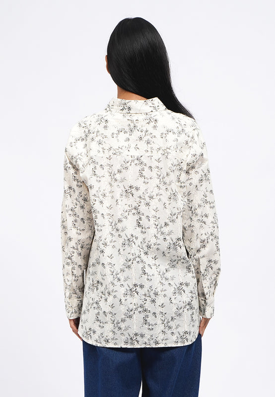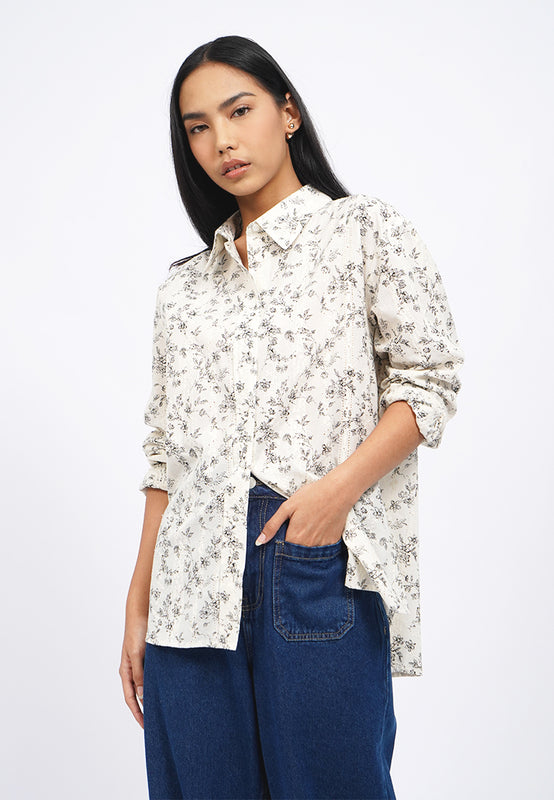 Kemeja lengan panjang, Printed fabric, Eyelet details, Front button opening, Material: Cotton Eyelet, Fit: Oversized, Color: Off White, Model info: Model Wearing Size S for Top, Size S for Pants, Model Height 165 cm, Bust: 86 cm, Waist: 63 cm, Hips: 78 cm