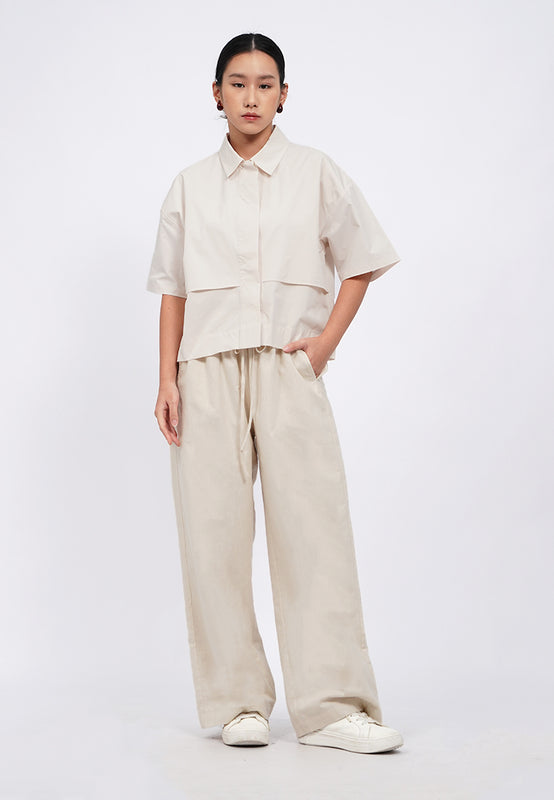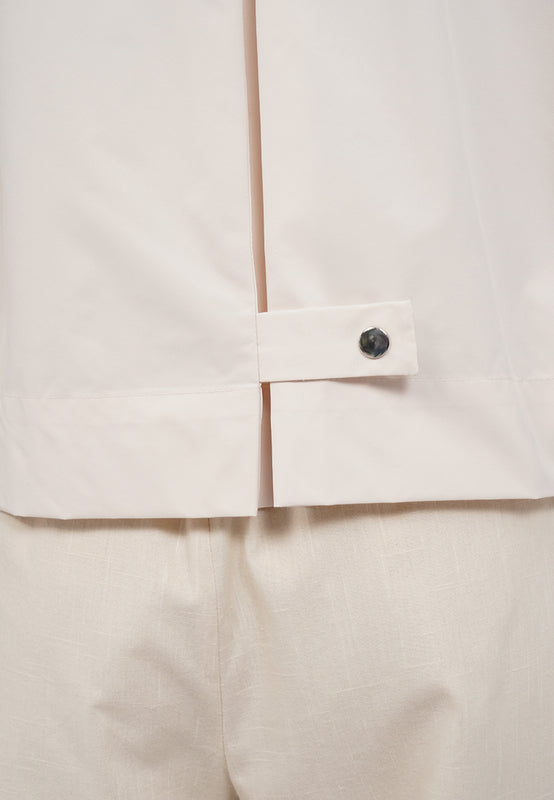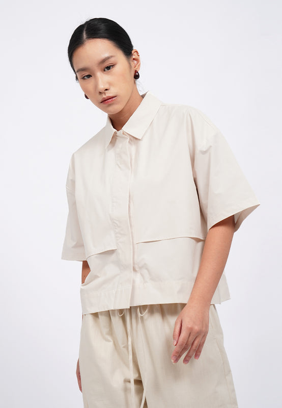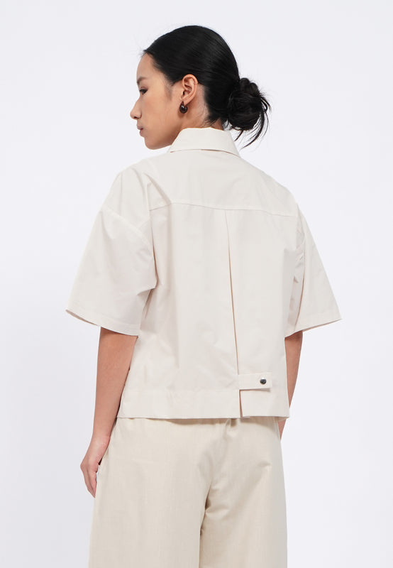 Kemeja lengan pendek, Front button with hidden placket, Back pleat with button details, Material: Poly Cotton, Fit: Regular, Color: Lt. Beige, Model info: Model Wearing Size S, Height: 165 cm, Bust: 82 cm, Waist: 63 cm, Hips: 83 cm