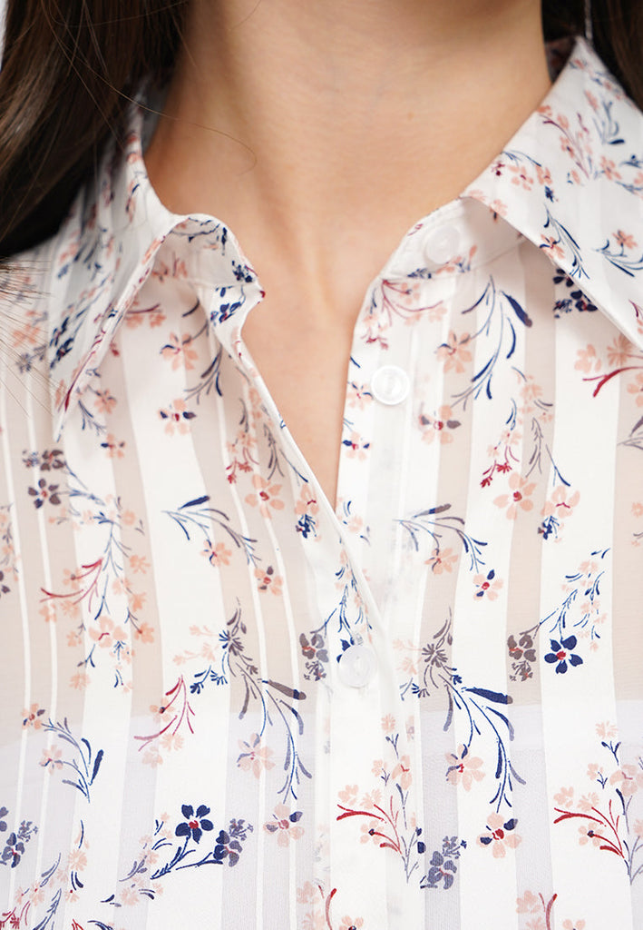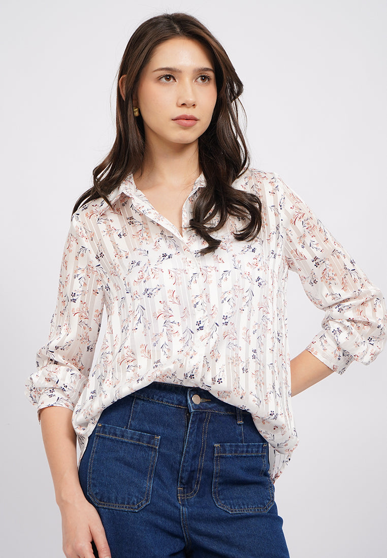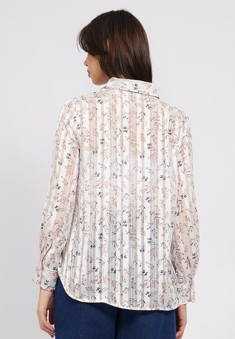 Blouse lengan panjang, Kerah kemeja, Printed sheer fabric, Front button opening, Material: Polyester, Fit: Regular, Color: Off White, Model info: Model Wearing Size S, Height: 175cm, Bust: 89, Waist: 69, Hips: 89, Art: 5-BLWKSG225K058
