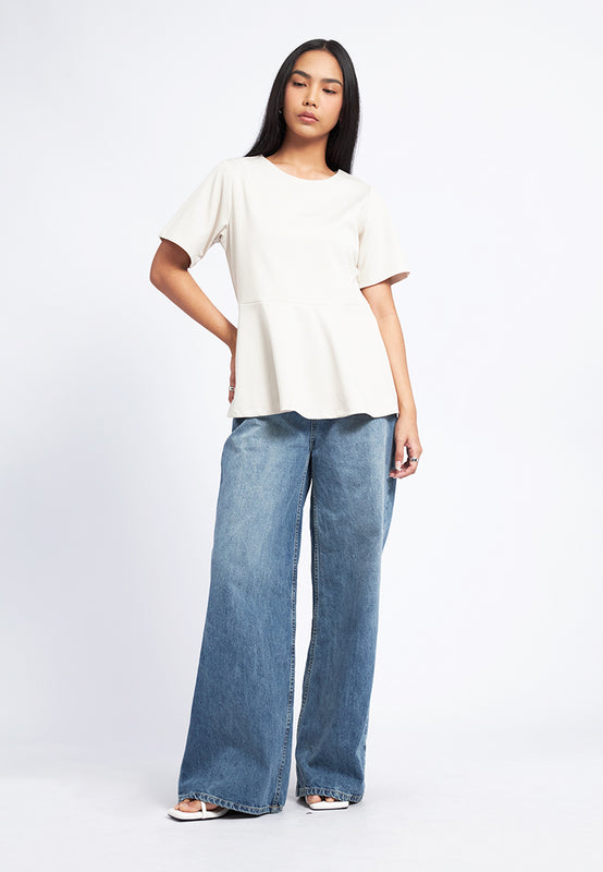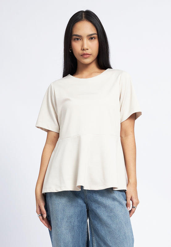 Atasan lengan pendek, Round neck, Peplum waist details, Back button opening, Material: Polyester, Fit: Regular, Color: Ecru, Model info: Model Wearing Size S for Top, Size S for Pants, Model Height 165 cm, Bust: 86 cm, Waist: 63 cm, Hips: 78 cm