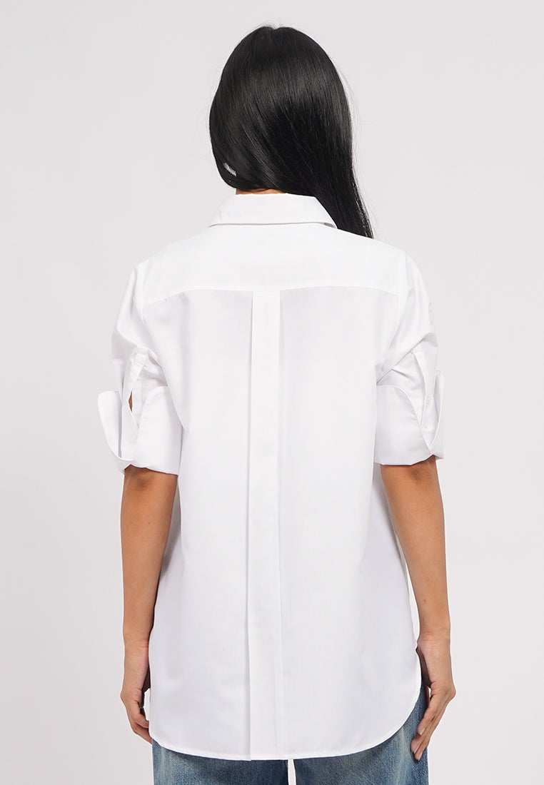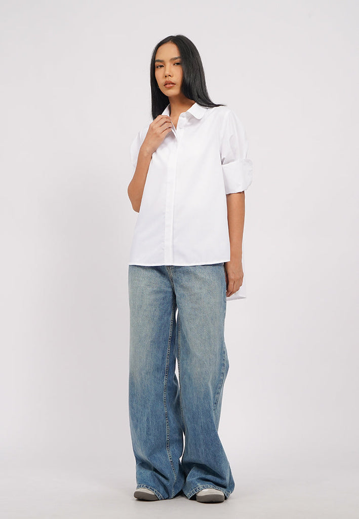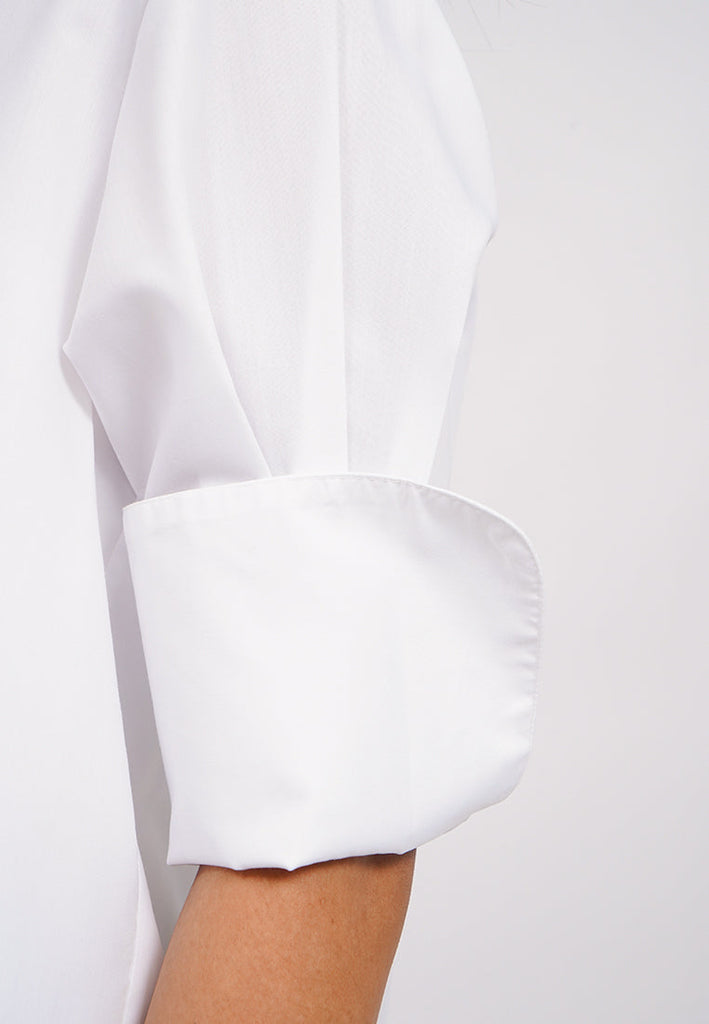 Blouse lengan pendek, Rounded shirt collar, Hi-low hemline, Front button opening, Material: Cotton, Fit: Regular, Color: White, Model info: Model Wearing Size S, Model Height: 165 cm, Bust: 86 cm, Waist: 63 cm, Hips: 78 cm, Art: 5-BSWKSG225J038