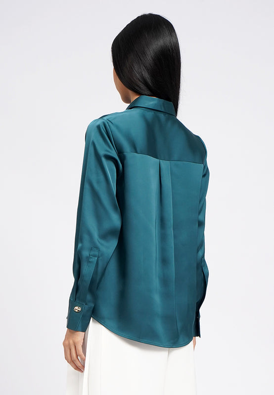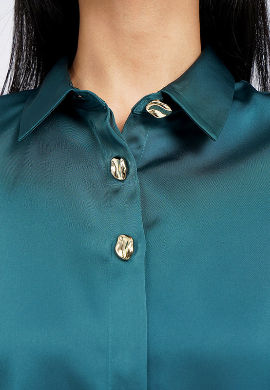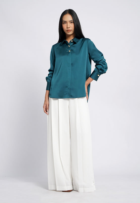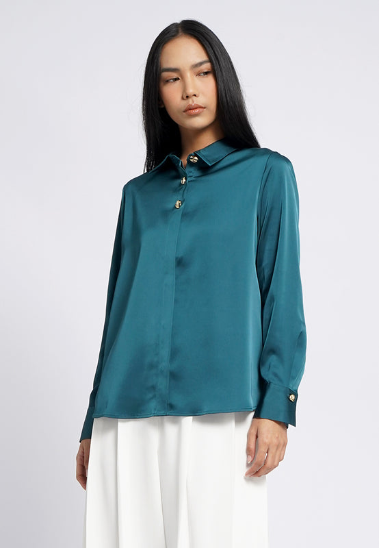 Blouse lengan panjang, Shirt collar, Front opening with fancy button details, Material: Church Silk, Fit: Regular, Color: Teal, Model info: Model Wearing Size S for Top, Size S for Pants, Model Height 165 cm, Bust: 86 cm, Waist: 63 cm, Hips: 78 cm