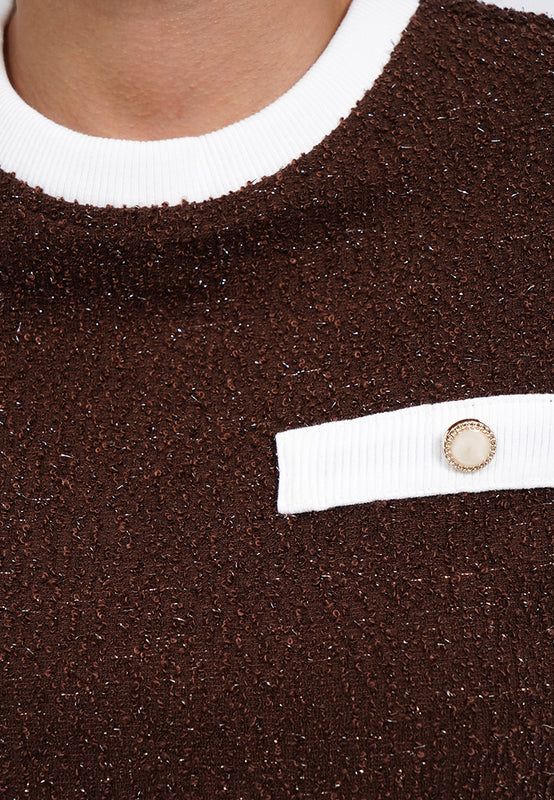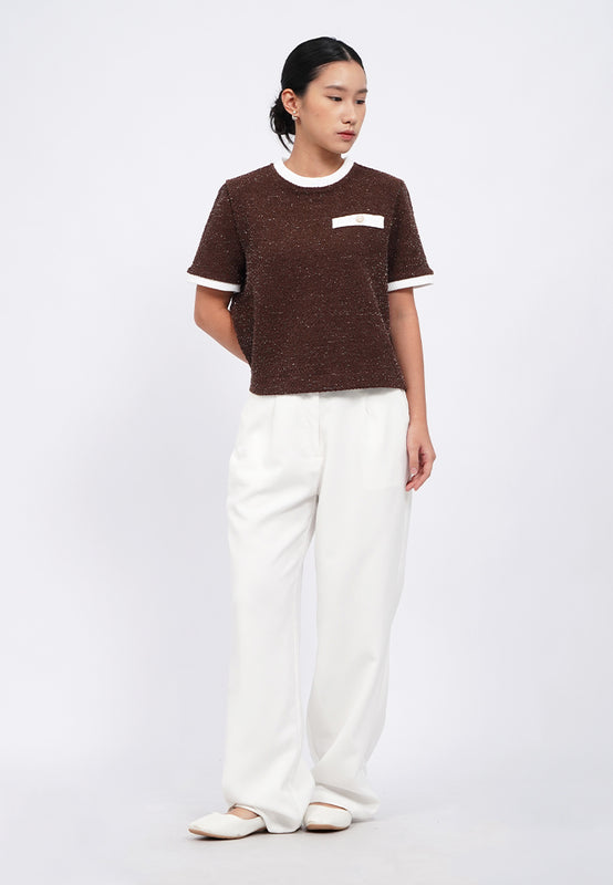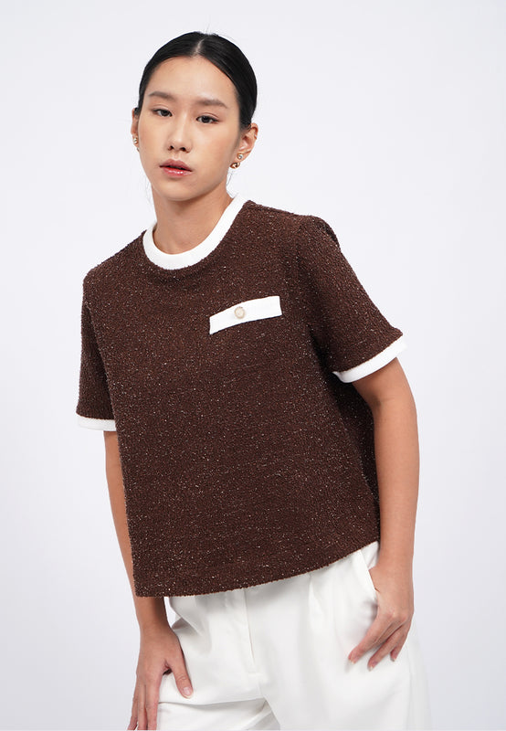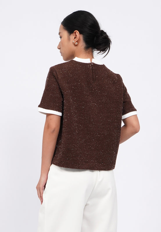 Blouse lengan pendek, Contrast round neck, Back button opening, Textured knit fabric, Material: Tweed Knit, Fit: Regular, Color: Brown, Model info: Model Wearing Size S, Height: 165 cm, Bust: 82 cm, Waist: 63 cm, Hips: 83 cm