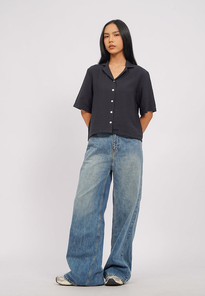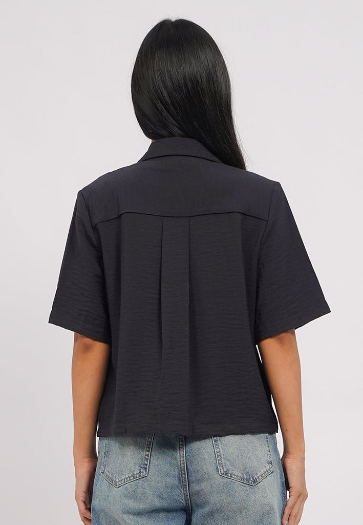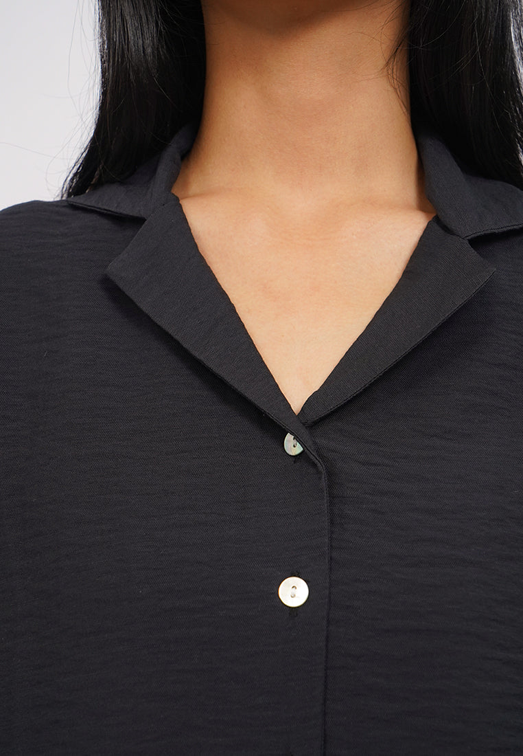 Blouse lengan pendek, Notch collar, Contrast front button opening, Textured fabric, Material: Rayon, Fit: Boxy, Color: Black, Model info: Model Wearing Size S, Model Height: 165 cm, Bust: 86 cm, Waist: 63 cm, Hips: 78 cm, Art: 5-BSWKCA225J119