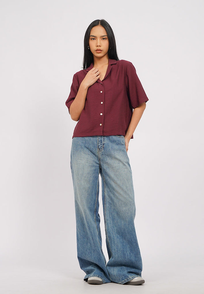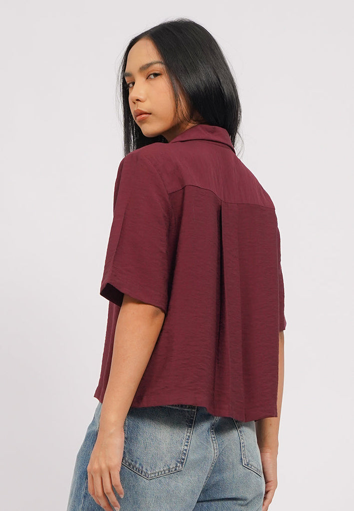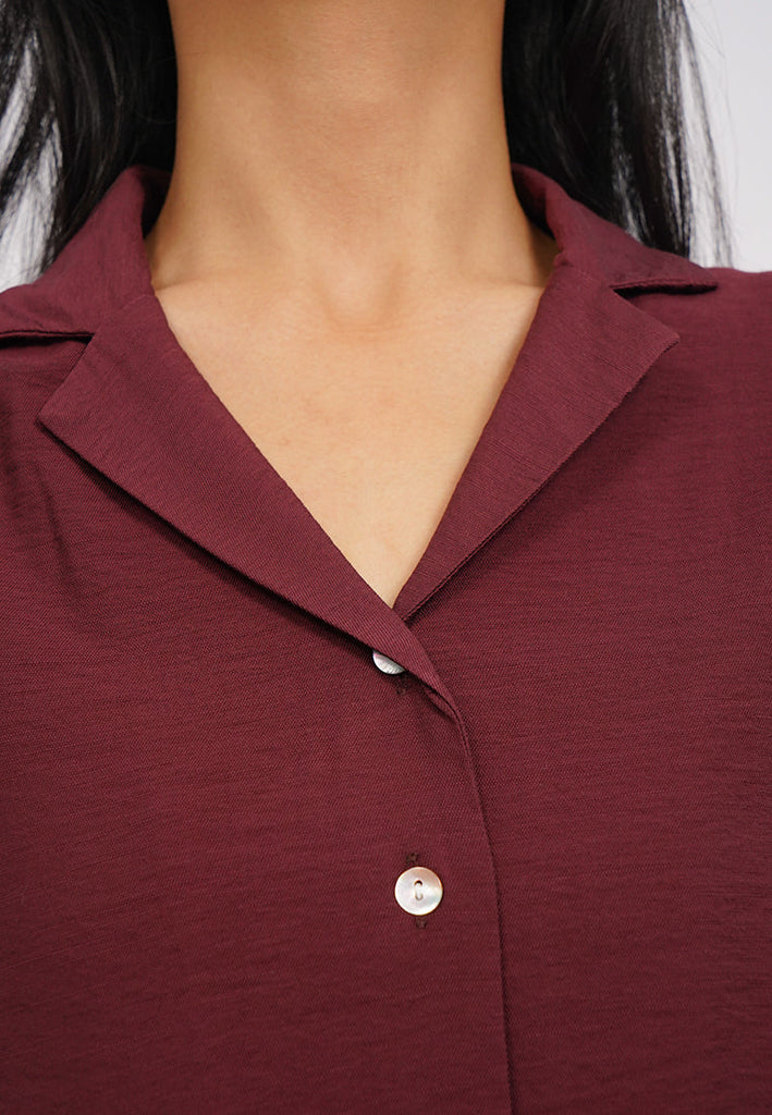 Blouse lengan pendek, Notch collar, Contrast front button opening, Textured fabric, Material: Rayon, Fit: Boxy, Color: Burgundy, Model info: Model Wearing Size S, Model Height: 165 cm, Bust: 86 cm, Waist: 63 cm, Hips: 78 cm, Art: 5-BSWKCA225J121