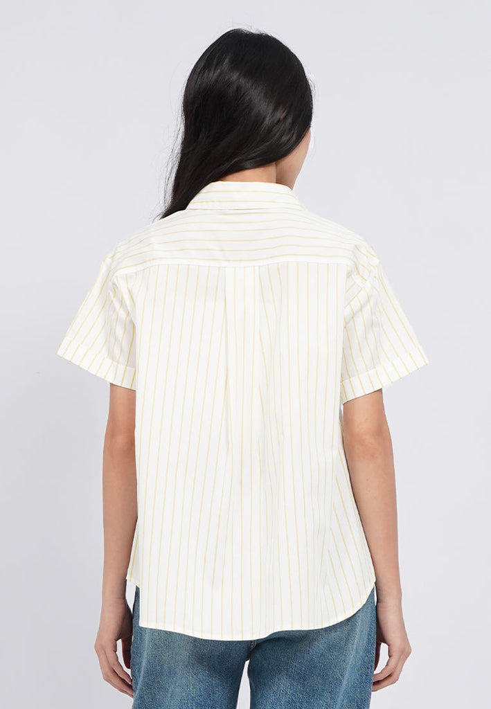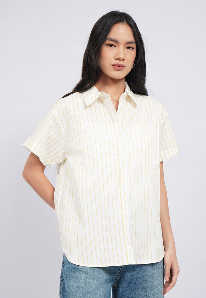 Blouse lengan pendek, Kerah kemeja, Squared front pocket, Boxy cut, Stripe printed fabric, Material: Cotton, Fit: Boxy, Color: Soft Yellow, Model info: Model Wearing Size S, Height: 168cm, Bust: 74cm, Waist: 62cm, Hips: 86cm