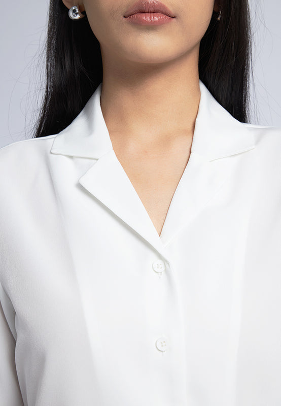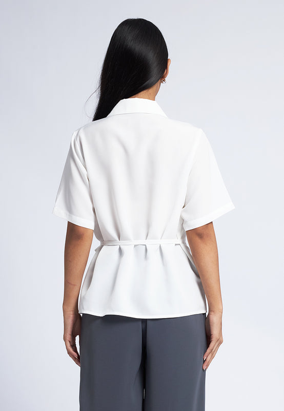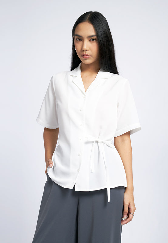 Blouse lengan pendek, Notch collar, Adjustable side tie details, Front button opening, Material: Polyester, Fit: Regular, Color: Off White, Model info: Model Wearing Size S for Top, Size S for Pants, Model Height 165 cm, Bust: 86 cm, Waist: 63 cm, Hips: 78 cm