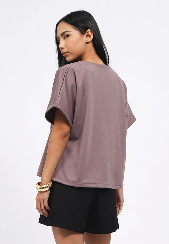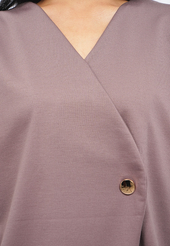 Blouse lengan pendek, V-neck, Batwing sleeves, Front wrap opening, Material: Polyester, Fit: Regular, Color: Taupe, Model info: Model Wearing Size S for Top, Size S for Pants, Model Height 165 cm, Bust: 86 cm, Waist: 63 cm, Hips: 78 cm