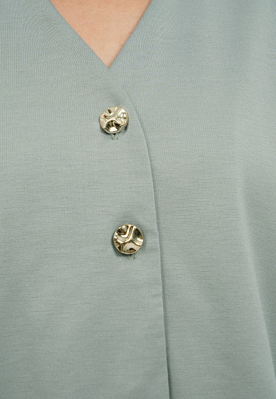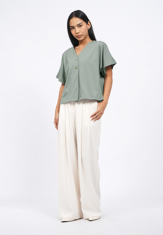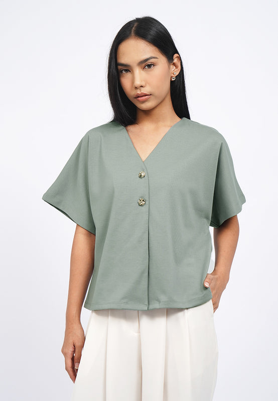 Blouse lengan pendek, V-neck, Batwing sleeves, Front button opening, Material: Polyester, Fit: Regular, Color: Ash, Model info: Model Wearing Size S for Top, Size S for Pants, Model Height 165 cm, Bust: 86 cm, Waist: 63 cm, Hips: 78 cm