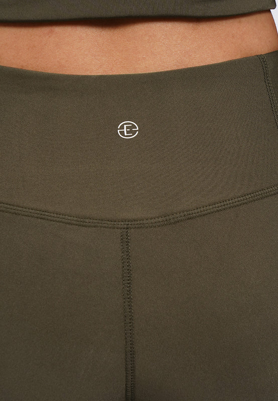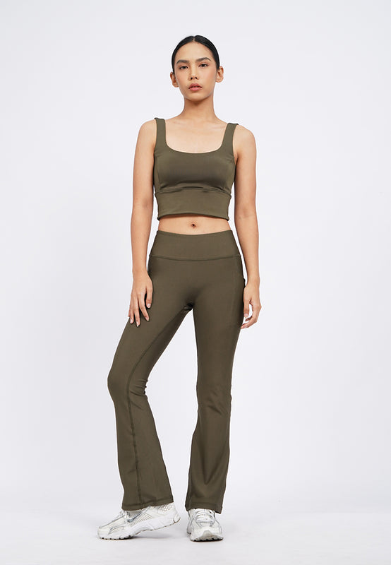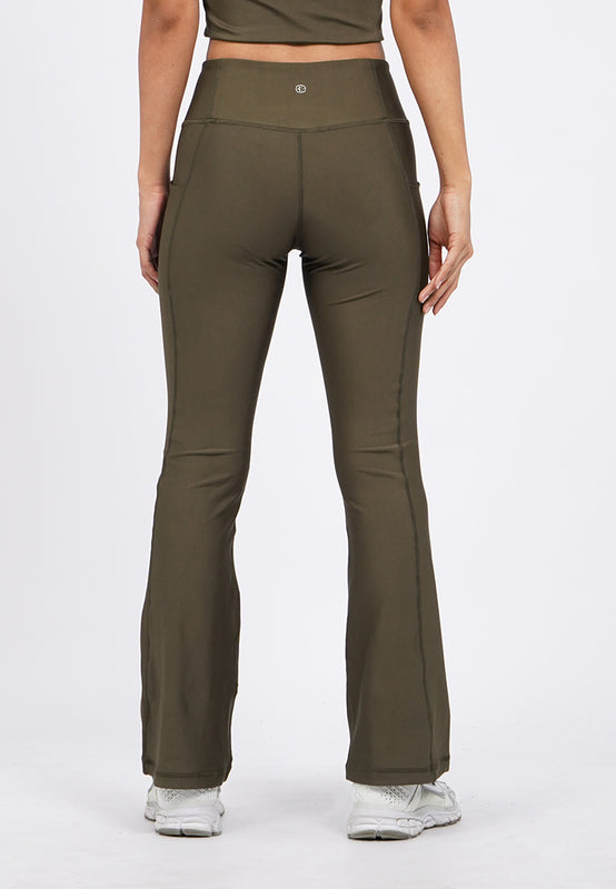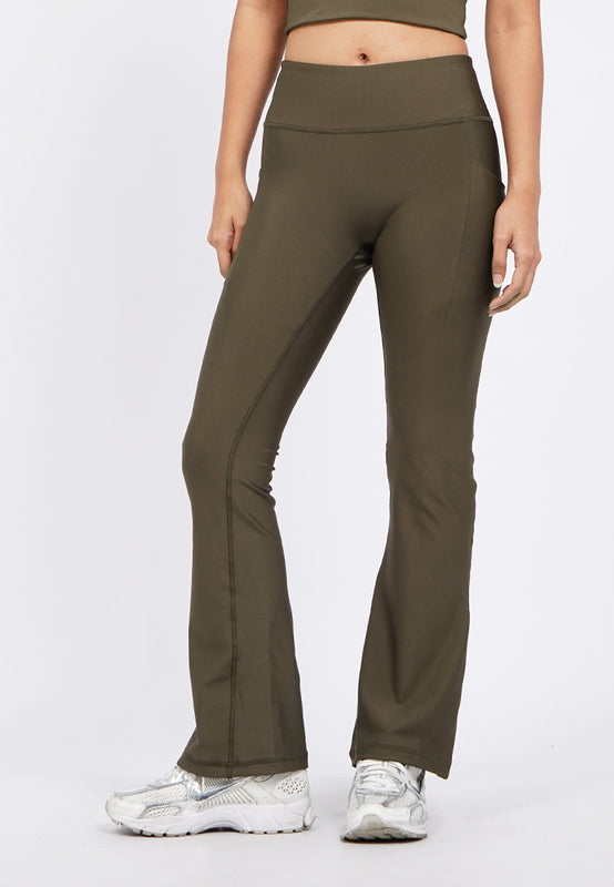 Flare sports legging, Mid waist, Contrast stitch, Back logo details, Material: Poly Spandex, Fit: Fitted, Color: Chocolate, Model info: Model Wearing Size S, Height: 165 cm, Bust: 86 cm, Waist: 63 cm, Hips: 78 cm