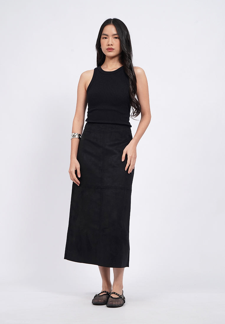Medium length skirt, A-line, Back zipper opening, Textured fabric, Material: Suede, Fit: Regular, Color: Black, Model info: Model Wearing Size S, Height: 175cm, Bust: 89, Waist: 69, Hips: 89, Art: 5-SDWKSG225I150