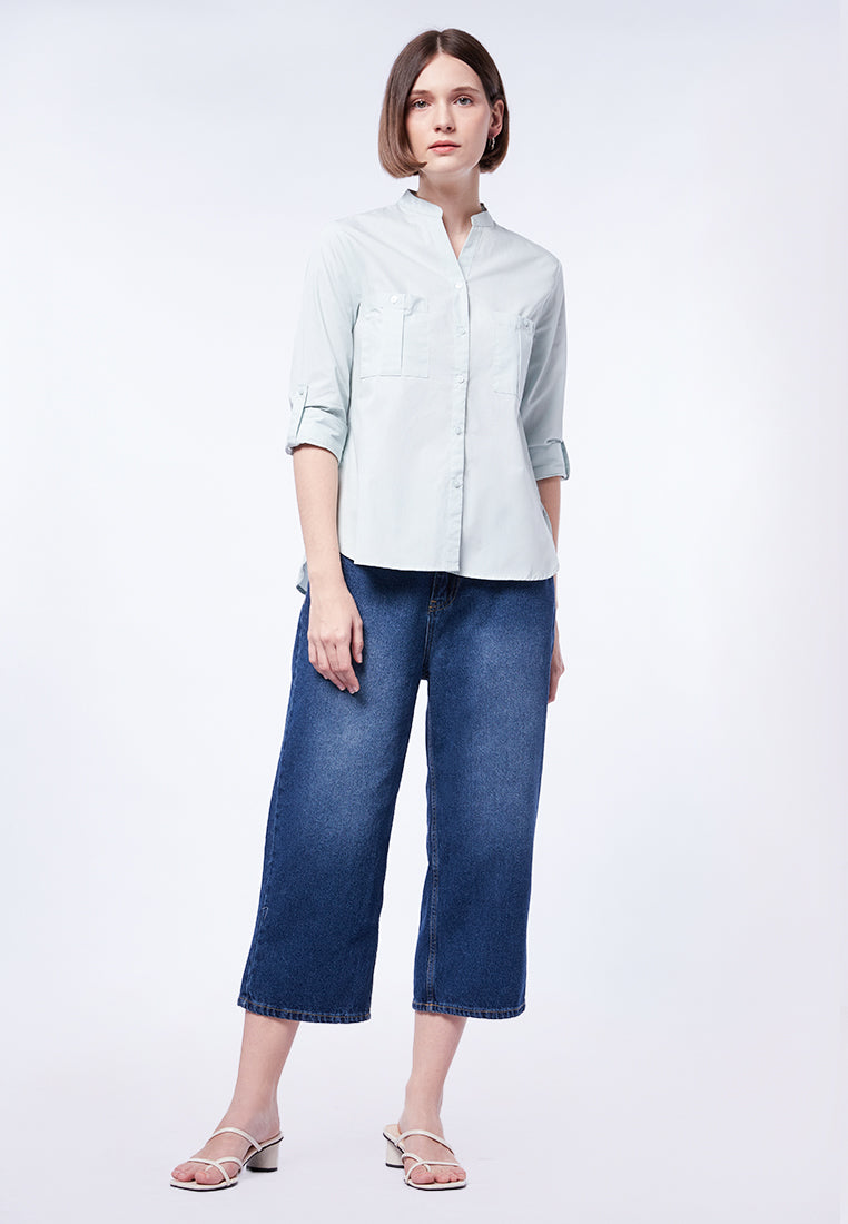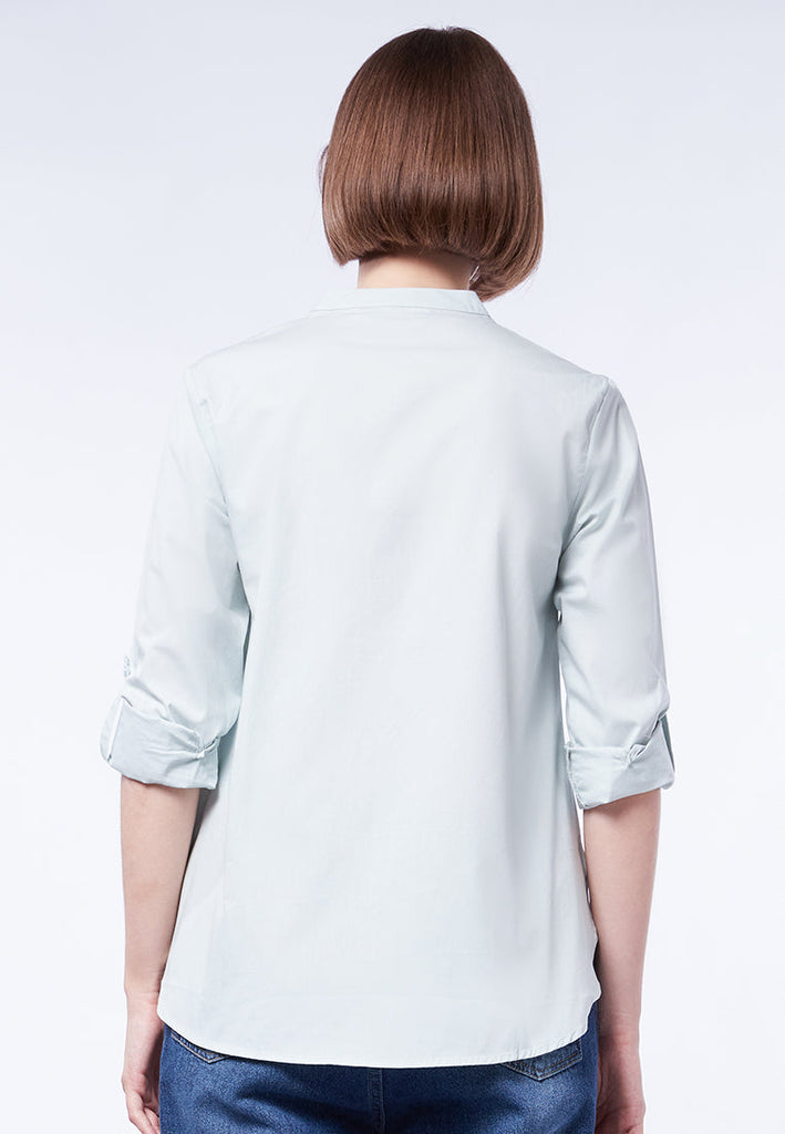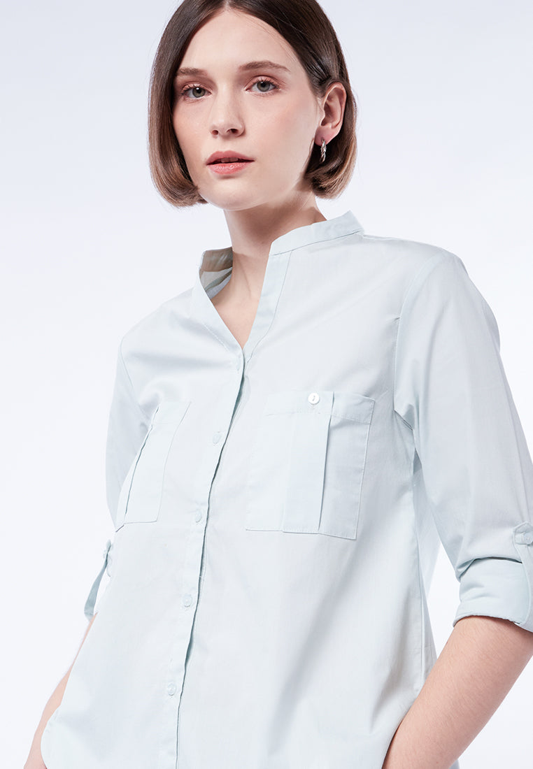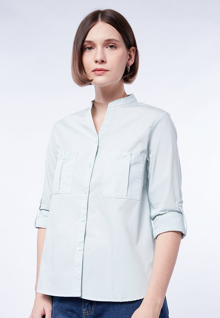 Blouse lengan panjang, V-neckline, Double front pocket with button, Roll up sleeves details, Material: Cotton, Fit: Regular Fit, Color: Lt. Blue, Model info: Model Wearing Size S for Top, Size 31 for Pants, Model Height 175 cm, Bust: 84 cm, Waist: 60 cm, Hips: 88 cm, Art: 5-BLWKCA122G031