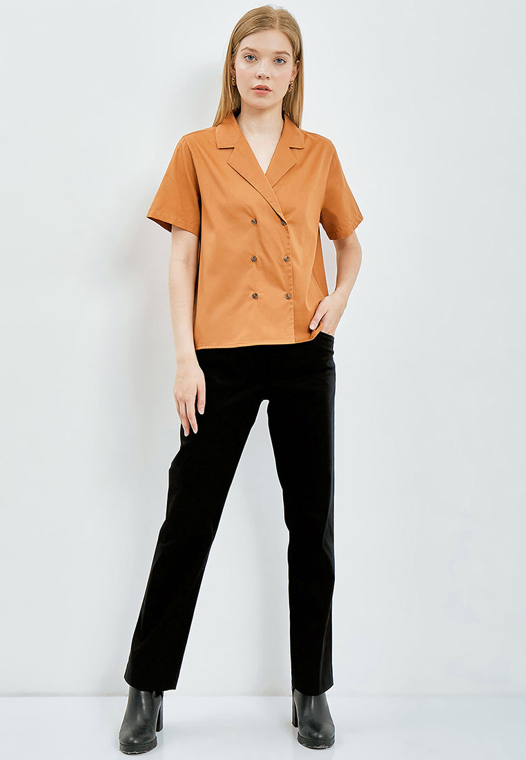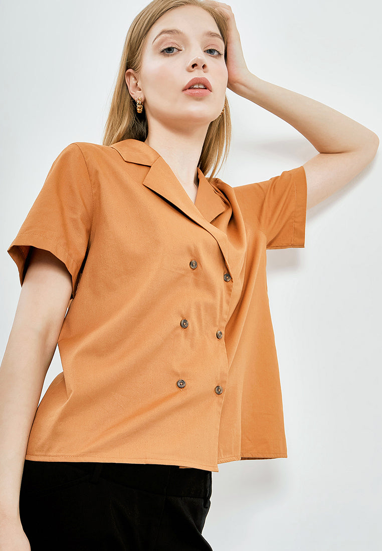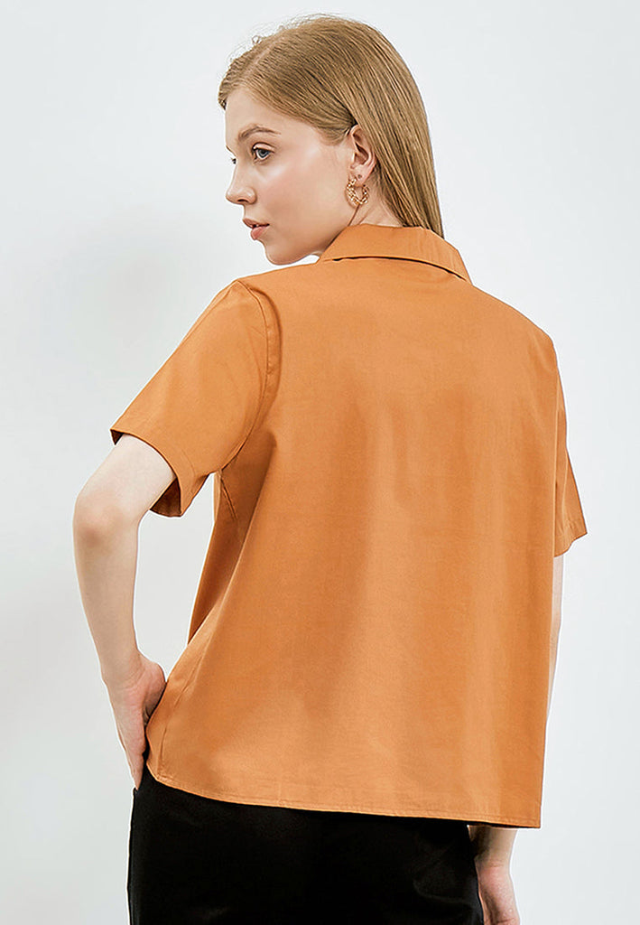 Blouse lengan pendek, Pajamas collar, Double front button opening, Regular length, Regular Fit, Material: Cotton Twill, Fit: Regular, Color: Camel, Model info: Model Wearing Size S for Top, Model height 171 cm, bust 78 cm, waist 59 cm, hips 88 cm, Art: 5-BSWKSG122D042