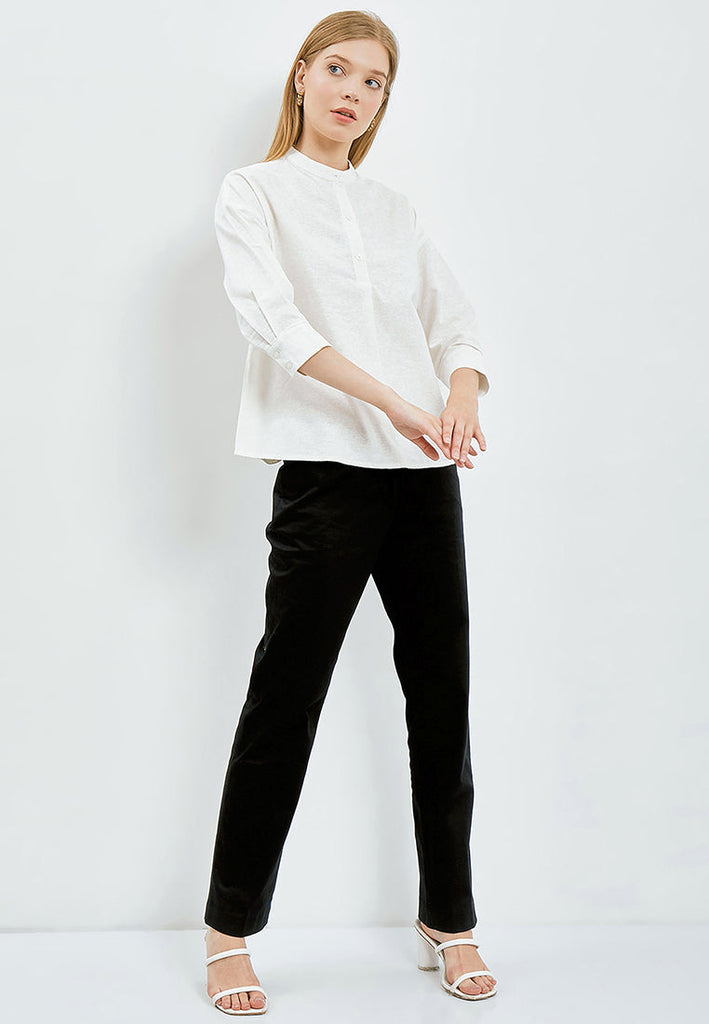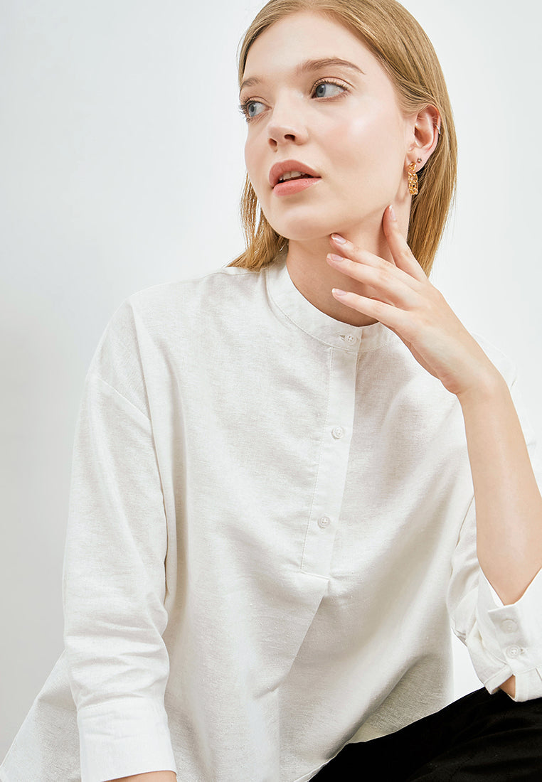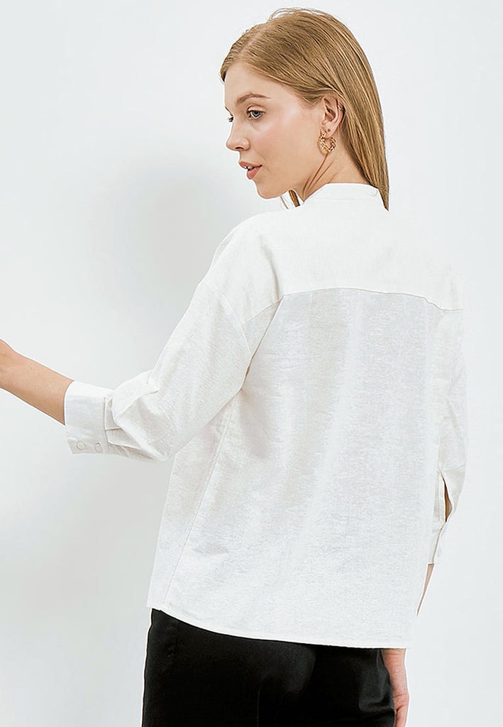 Blouse lengan 3/4, Mandarin collar, Front button opening, Pleat details at front, Material: Cotton Linen, FIT: REGULAR, Color: Off White, Model info: Model Wearing Size S for Top, Model Height 171 cm, Bust: 78 cm, Waist: 59 cm, Hips: 88 cm, Art: 5-BLWKCA122G033