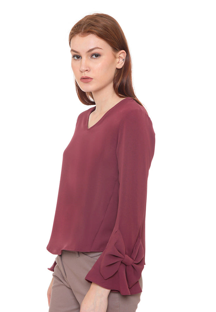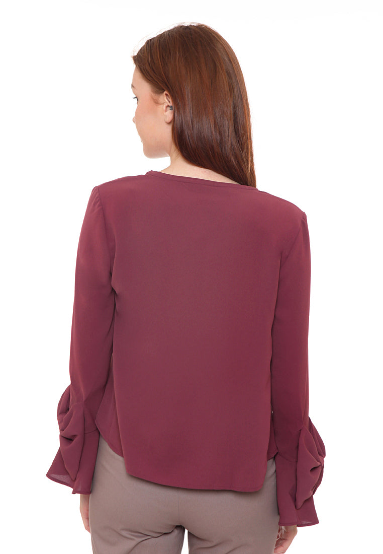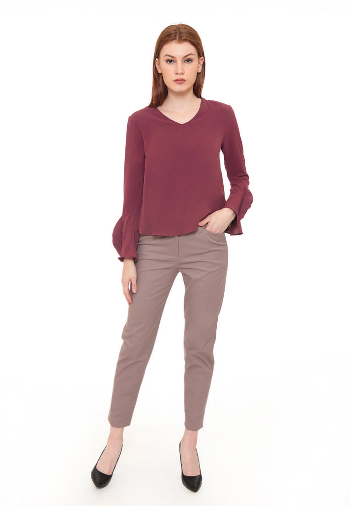 Blouse, Lengan Panjang, Kerah V, Ruffle detail, Regular fit, Material: Polyester, Fit: Regular, Color: Mauve, Model info: Model height 175 cm, bust 80 cm, waist 60 cm, hips 88 cm, Art: 5-BLWSIG218K093