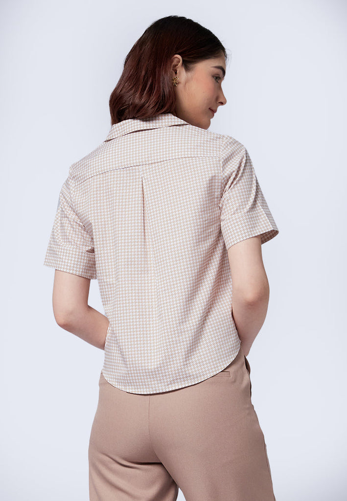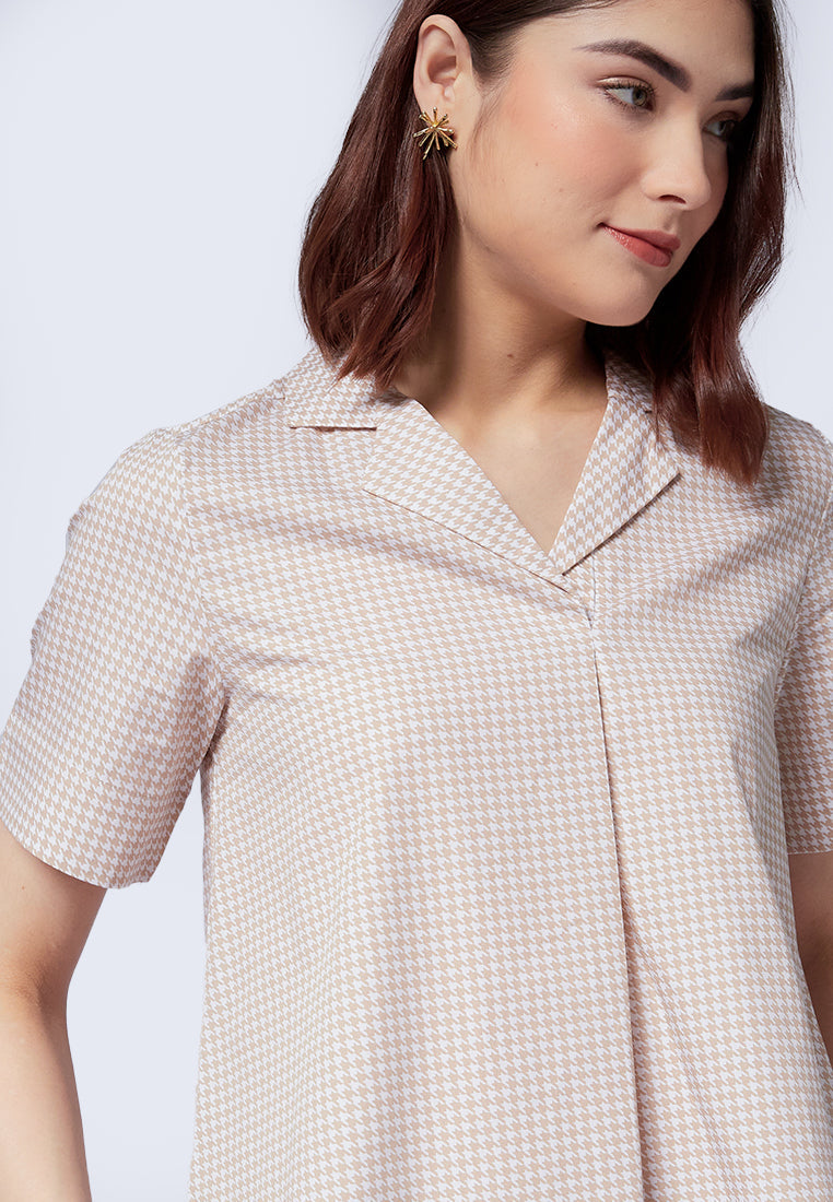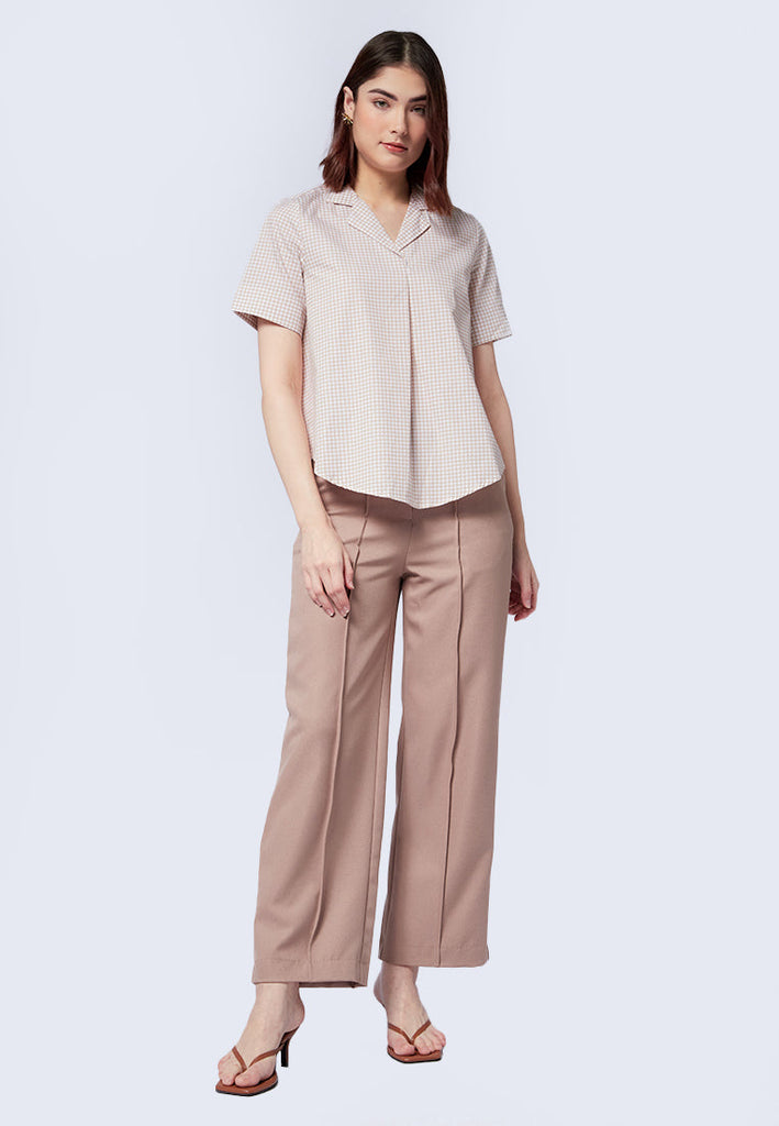 Blouse lengan pendek, Notch collar, Front pleat details, Gingham printed fabric, Material: Cotton, Fit: Regular, Color: Beige, Model info: Model Wearing Size S for Top, Size 25 for Pants, Model Height 175 cm, Bust: 84 cm, Hips: 90 cm, Art: 5-BSWKSG124C044