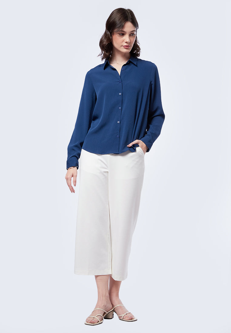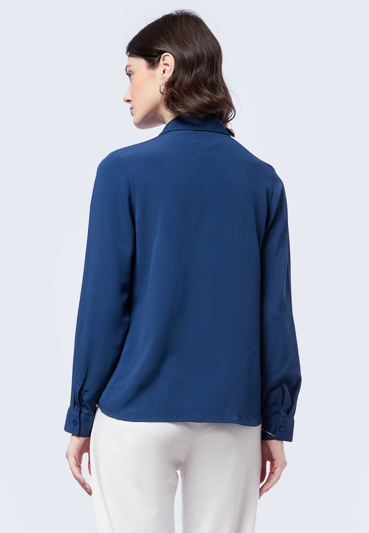 Blouse lengan panjang, Kerah kemeja, Textured fabric, Front button opening, Material: Poly Crinkle, Fit: Regular, Color: Navy, Model info: Model Wearing Size S for Top, Size S for Pants, Model Height 176 cm, Bust: 84 cm, Waist: 60, Hips: 90 cm, Art: 5-BLWKSG223J023